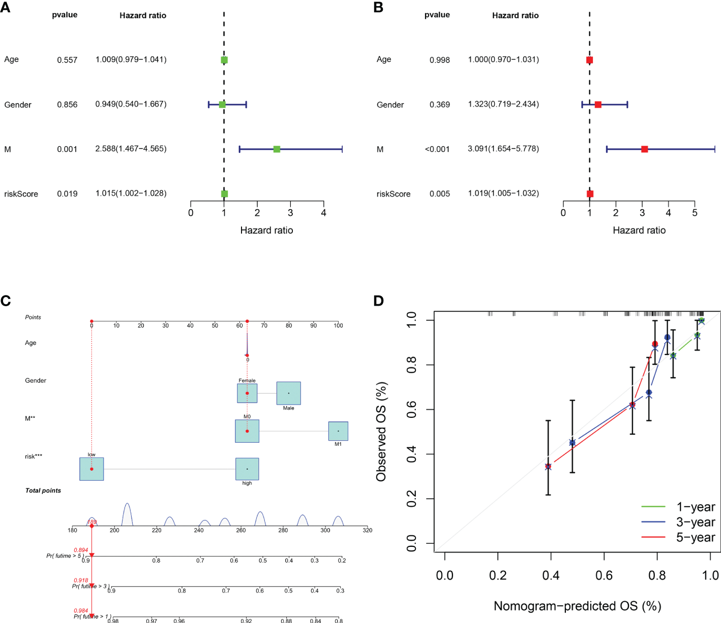 To determine if the risk score and the other clinical characteristics are independent prognostic factors for osteosarcoma patients, univariate and multivariate Cox regression analyses were conducted. Univariate Cox regression analysis revealed the risk score (P = 0.019) and the clinical pathological parameters of metastasis (P = 0.001) were independent prognostic factors for osteosarcoma patients (Figure 6A), and multivariate Cox regression analysis showed the same results (Figure 6B). Furthermore, we developed a prognostic nomogram for estimating the osteosarcoma patients’ survival likelihood (Figure 6C). This prognostic nomogram could systematically anticipate the 1-, 3-, and 5-year OS of osteosarcoma patients. The calibration curve showed that actual results were consistent with predicted results (Figure 6D).