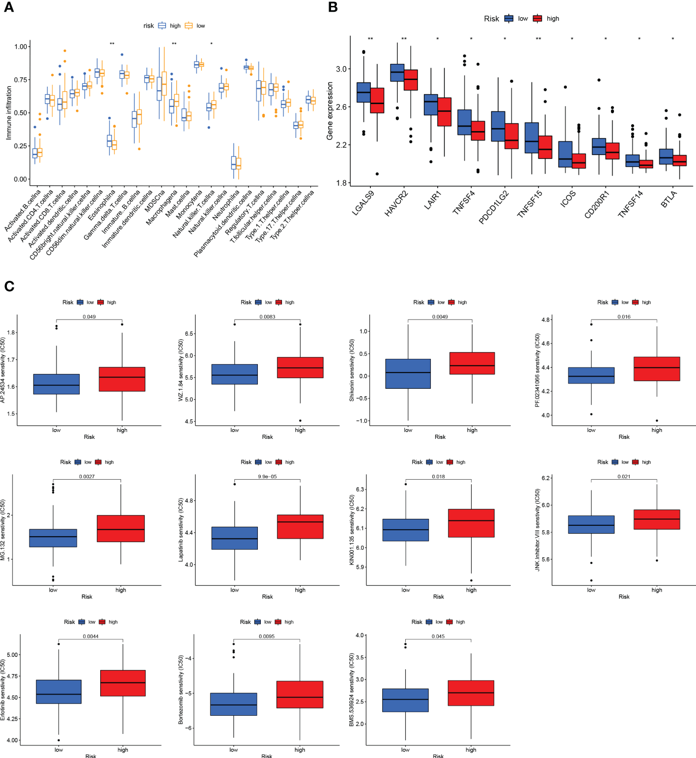 Immune status and drug sensitivity differences between high- and low-risk groups. (A) Comparison of immune cell infiltration between the high-risk group and low-risk group. (B) Comparison of the expression of immune checkpoints between the high-risk group and low-risk group. (C) Drug sensitivity in the high-risk group and low-risk group. *P < 0.05, **P < 0.01.