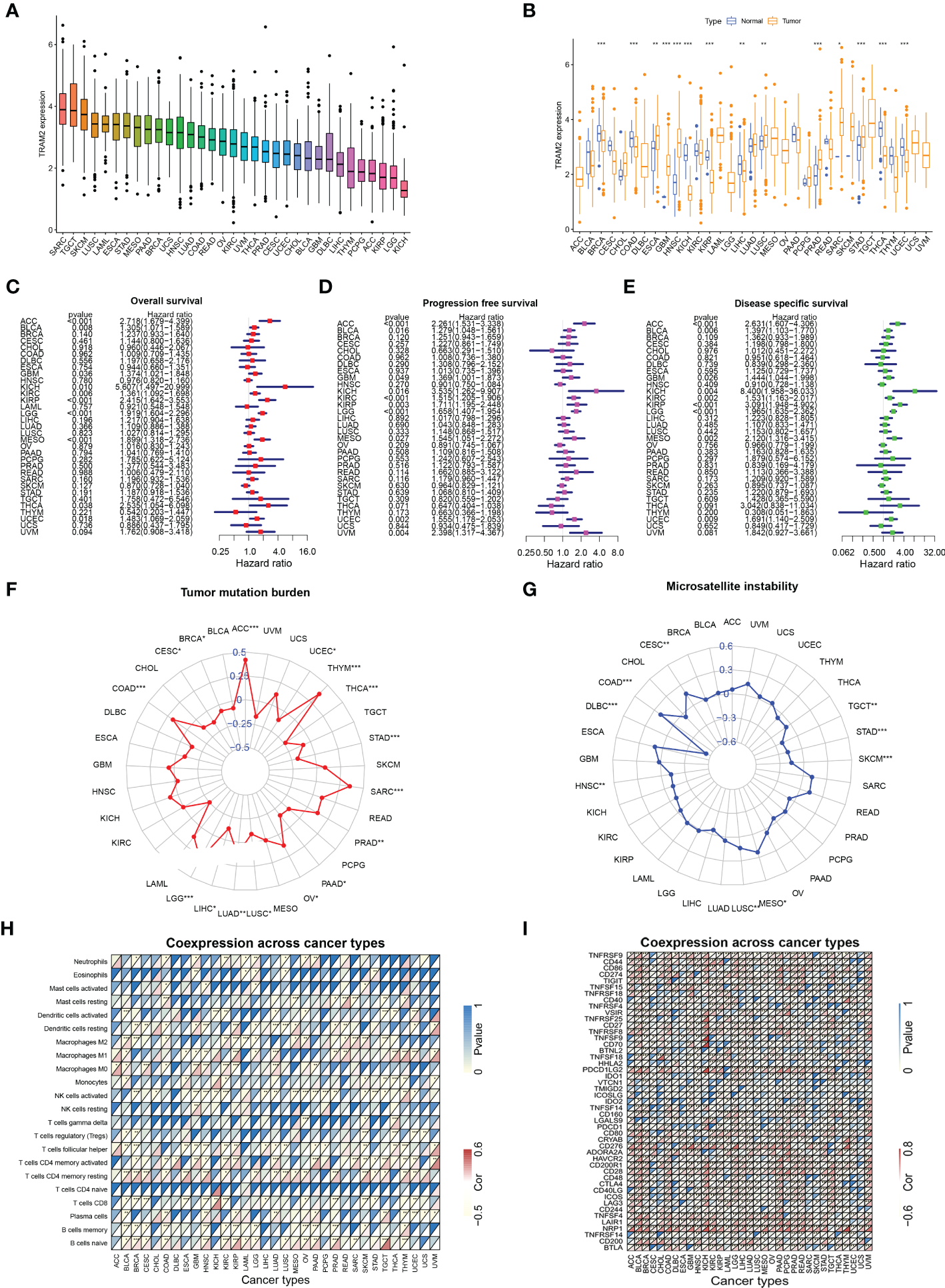 Analysis of TRAM2 in pan-cancer. (A) Expression of TRAM2 in 33 cancers. (B) Expression of TRAM2 in tumor and normal tissue in pan-cancer. (C) Overall survival of TRAM2 in pan-cancer. (D) Progression free survival of TRAM2 in pan-cancer. (E) Disease specific survival of TRAM2 in pan-cancer. (F) Tumor mutation burden of TRAM2 in pan-cancer. (G) Microsatellite instability of TRAM2 in pan-cancer. (H) Co-expression analysis of TRAM2 and immune cells in pan-cancer. (I) Co-expression analysis of TRAM2 and immune checkpoints in pan-cancer. *P < 0.05, **P < 0.01, ***P < 0.001.