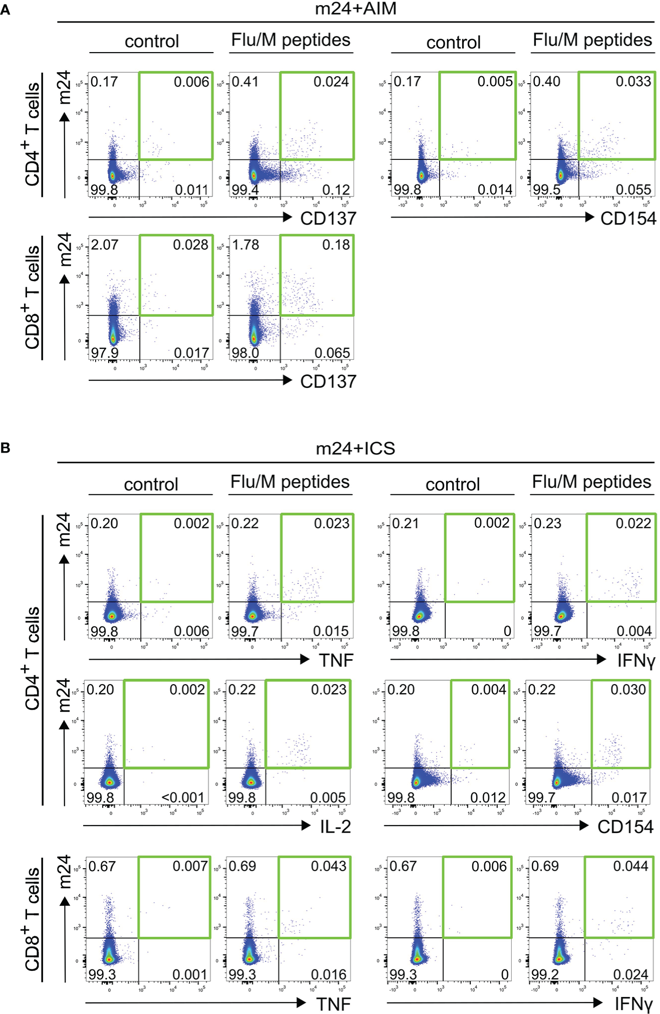 Figure 2 Detection of antigen-specific T cells using m24+AIM (A) or m24+ICS (B). Exemplary dot plots of PBMCs from donor HD6 incubated with Flu/M overlapping peptides or left unstimulated for 14 h in the presence of CD40 Ab (m24+AIM) or brefeldin A and monensin (m24+ICS). (A) m24+AIM: m24 Ab staining in combination with CD137 or CD154 expression on CD4+ T cells, or m24 Ab staining and CD137 expression on CD8+ T cells (B) m24+ICS: m24 Ab staining in combination with intracellular TNF, IFNγ, IL-2 and CD154 expression for CD4+ T cells, or intracellular TNF and IFNγ expression for CD8+ T cells. Numbers represent frequencies within CD4+ or CD8+ T cells. The green squares in (A, B) mark the populations of interest co-expressing two markers.