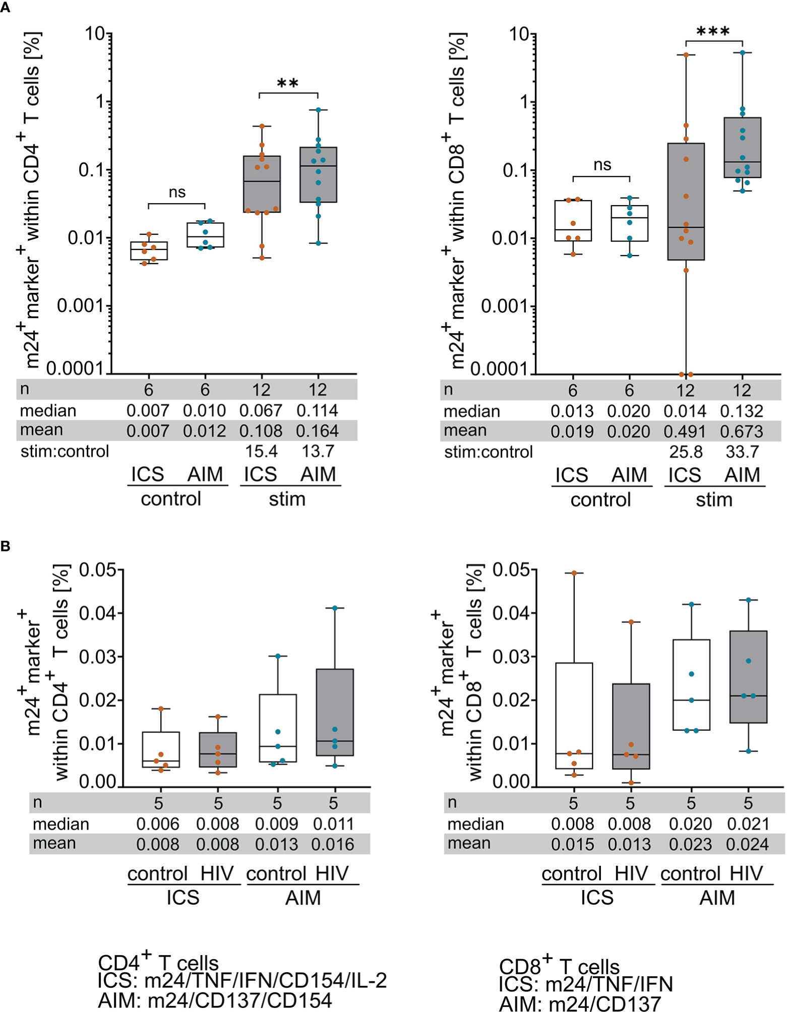Figure 3 m24+AIM staining detects antigen-specific T cells with increased sensitivity compared to m24+ICS. PBMCs were incubated with antigenic peptides or left unstimulated for 14 h in the presence of CD40 Ab (m24+AIM) or brefeldin A and monensin (m24+ICS). Summed frequencies of m24+ and at least one additional marker+ T cells after Boolean gating are presented as box and whisker plots showing median, interquartile range, minimum and maximum for control and peptide-stimulated CD4+ (left graphs) and CD8+ (right graphs) T cells detected with m24+ICS or m24+AIM. Number of samples (n), median, mean and stimulated:control ratios (stim:control) are indicated. (A) Comparison of CD4+ (left) and CD8+ (right) T cell frequencies detected with m24+ICS or m24+AIM in unstimulated control and peptide-stimulated tests (n=6 HD, 12 donor/antigen combinations). Frequencies of stimulated samples are background subtracted. Values that were 0 were set to 0.0001. (B) Comparison of CD4+ (left) and CD8+ (right) T cell frequencies detected with m24+ICS or m24+AIM in control or HIV peptide-supplemented samples (n=5 HD). To compare both conditions, HIV tests were not background subtracted. Wilcoxon matched pairs, p<0.05 (** 0.002, *** < 0.001). ns, not significant.