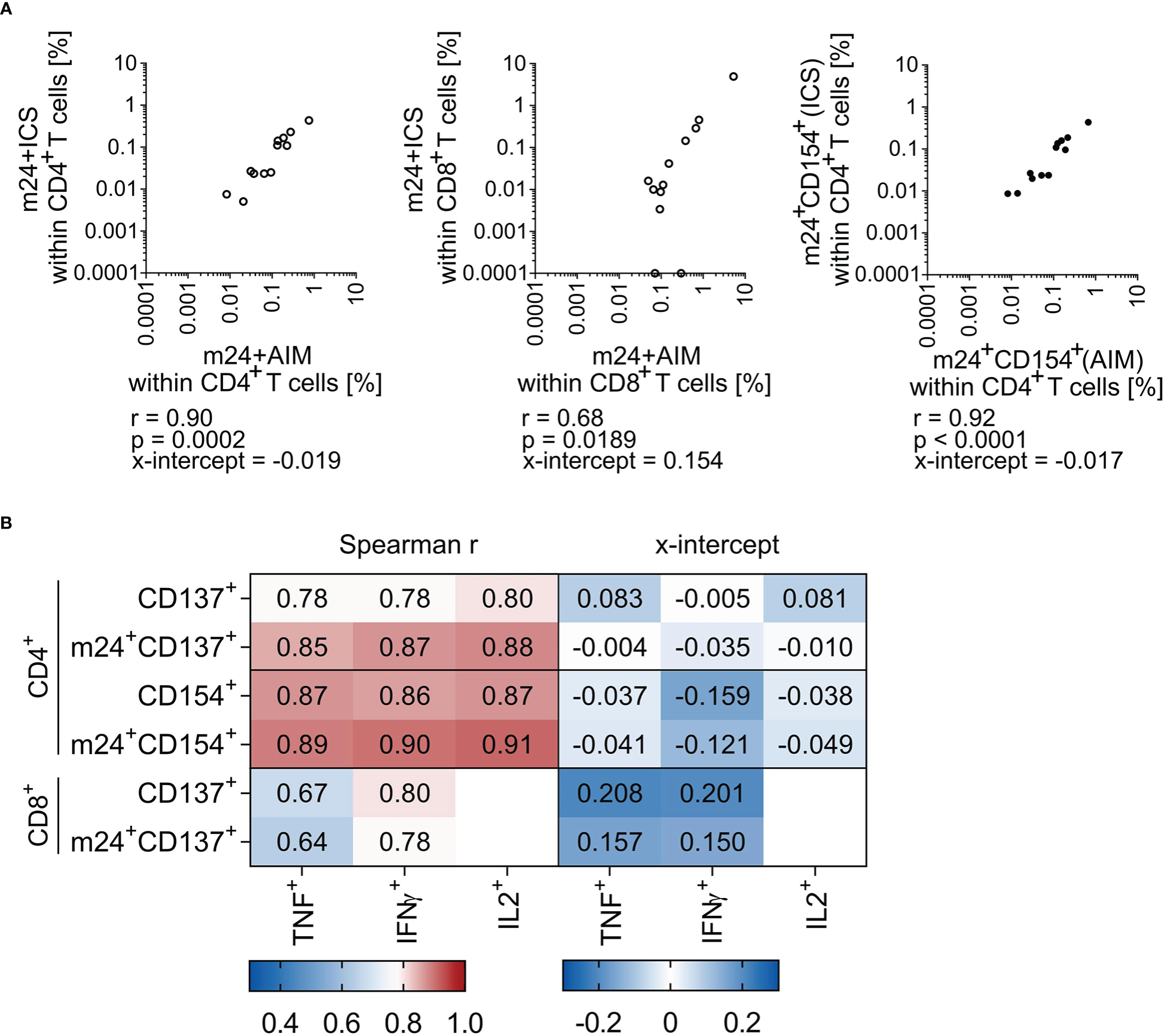 Figure 4 Frequencies of antigen-specific T cells assessed by m24+AIM correlate with those detected with m24+ICS. Correlation between antigen-specific T cell frequencies assessed by AIM or ICS in HD PBMCs (n=12 donor/antigen combinations). Spearman r (p<0.05) and x-intercepts are indicated. Frequencies of stimulated samples are background subtracted. Values that were 0 were set to 0.0001. (A) Comparison of frequencies detected with m24+AIM vs m24+ICS (summed frequencies of m24+ and at least one additional marker+ after Boolean gating) for CD4+ (left) and CD8+ (middle) T cells. Comparison of extracellular vs intracellular CD154 staining for CD4+ T cells (right). (B) Heat map of Spearman r (left) and x-intercept (right). Frequencies of antigen-specific CD4+ (top) and CD8+ (bottom) T cells detected by single AIMs or in combination with m24 Ab staining were compared to single cytokine expression. Corresponding correlation graphs are shown in Supplementary Figure 3.