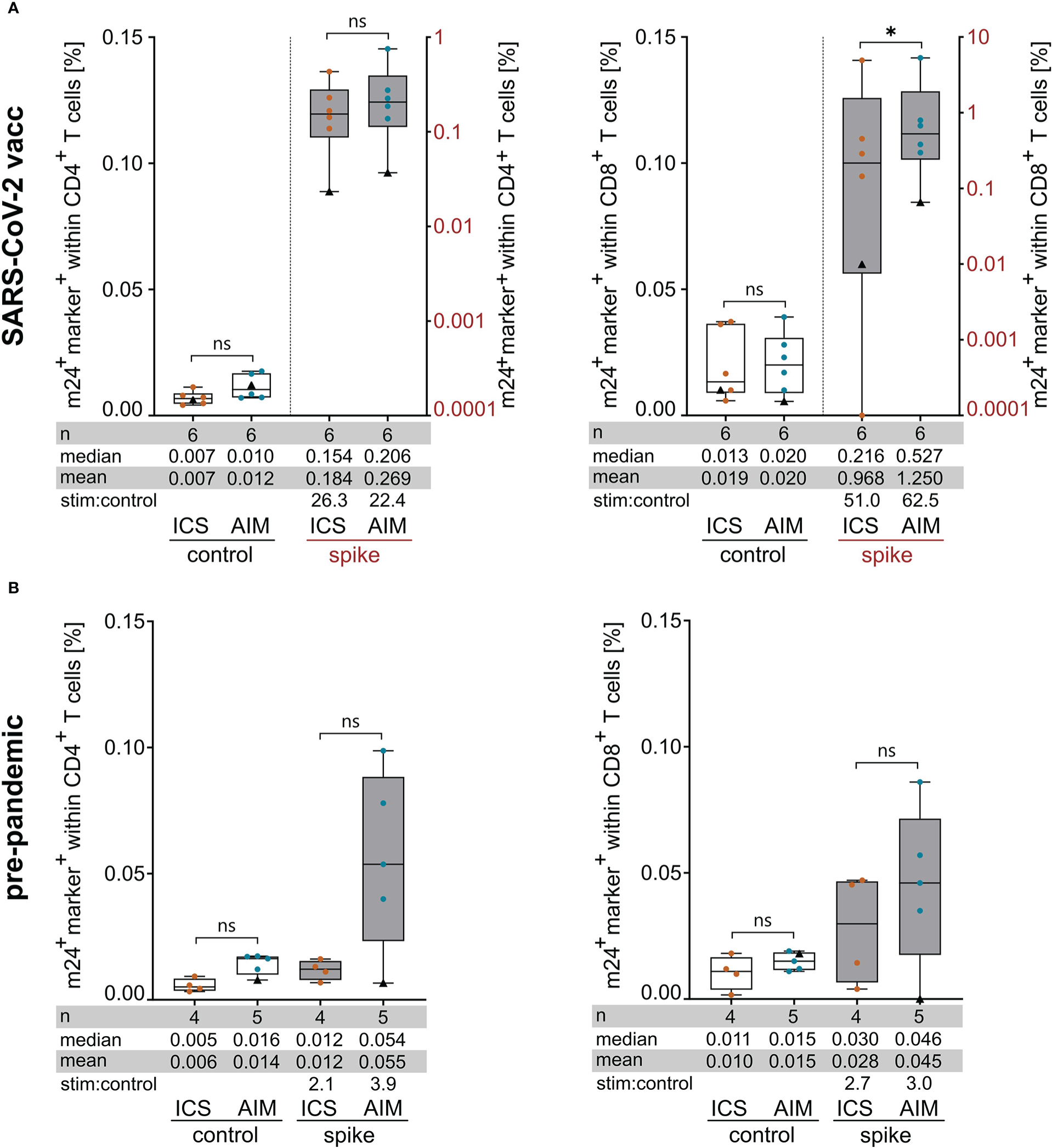 Figure 5 Assessment of spike-specific T cell responses with m24+ICS and m24+AIM in SARS-CoV-2 vaccinated (A) and pre-pandemic (B) healthy donors. PBMCs were incubated with SARS-CoV-2/S overlapping peptides or left unstimulated for 14 h in the presence of CD40 Ab (m24+AIM) or brefeldin A and monensin (m24+ICS). Summed frequencies of m24+ and at least one additional marker+ T cells after Boolean gating are presented as box and whisker plots showing median, interquartile range, minimum and maximum for CD4+ (left graphs) and CD8+ (right graphs) T cells. Number of donors (n), median, mean and stimulated:control ratios (stim:control) are indicated. For donor HD7 (black triangle), pre-pandemic and post-vaccination samples are shown. Frequencies of stimulated samples are background subtracted. (A) T cell responses in SARS-CoV-2 vaccinated donors (n=6 HD). Frequencies of marker+ cells in unstimulated controls (left y-axis) and after spike-peptide stimulation (right y-axis) are plotted for CD4+ and CD8+ T cells. This dataset is also part of Figures 1, 3 and 4. Values that were 0 were set to 0.0001. (B) Frequencies of marker+ cells in pre-pandemic PBMCs tested with m24+AIM (n=5 HD) and m24+ICS (n=4 HD, donor HD7 symbolized by a black triangle was tested only with m24+AIM). p<0.05 (* 0.03). ns, not significant.