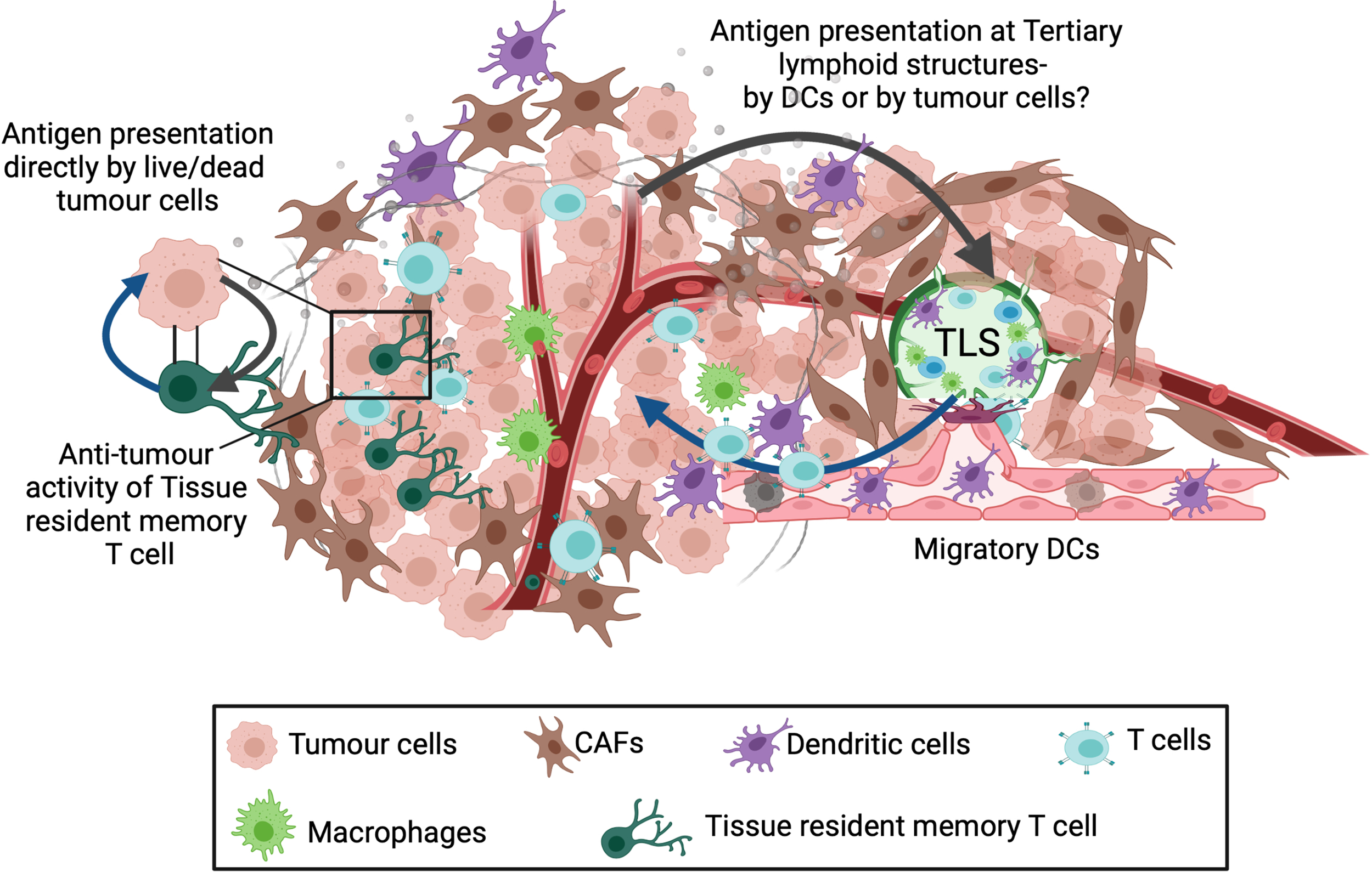 Alternate sites of antigen presentation and T-cell priming. Three different sites for presentation of tumour associated antigens have been described: Tumour draining lymph node (TDLN), Tertiary lymphoid structures (TLS) and Tissue resident memory T cells. A population of memory precursor cells are believed to differentiate into CD103+ tissue resident memory T cells. These cells reside in the tumour and can recognize tumour antigens followed by killing the target tumour cell. In addition, tertiary lymphoid structures (TLS) also present a potential site for T cell priming. TLSs are organised cell aggregates formed within or at tumour margins in response to local inflammation and numerous cell-cell interactions occurring within the TME. Since these contain various immune cell types, TLSs can activate local immune response against the tumour, however the mechanism for T-cell priming within the TLSs is unknown.