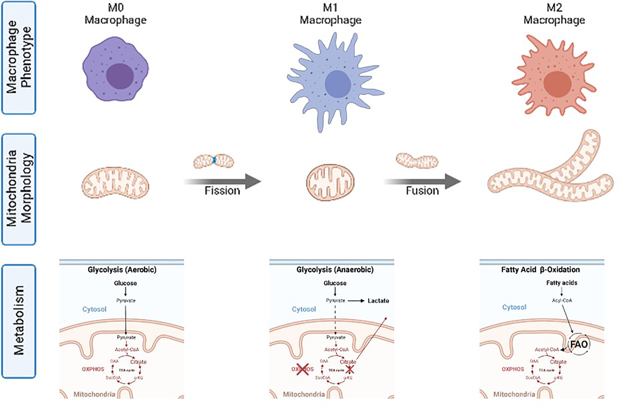 Macrophage phenotypes, mitochondria morphology and corresponding catabolic pathways.