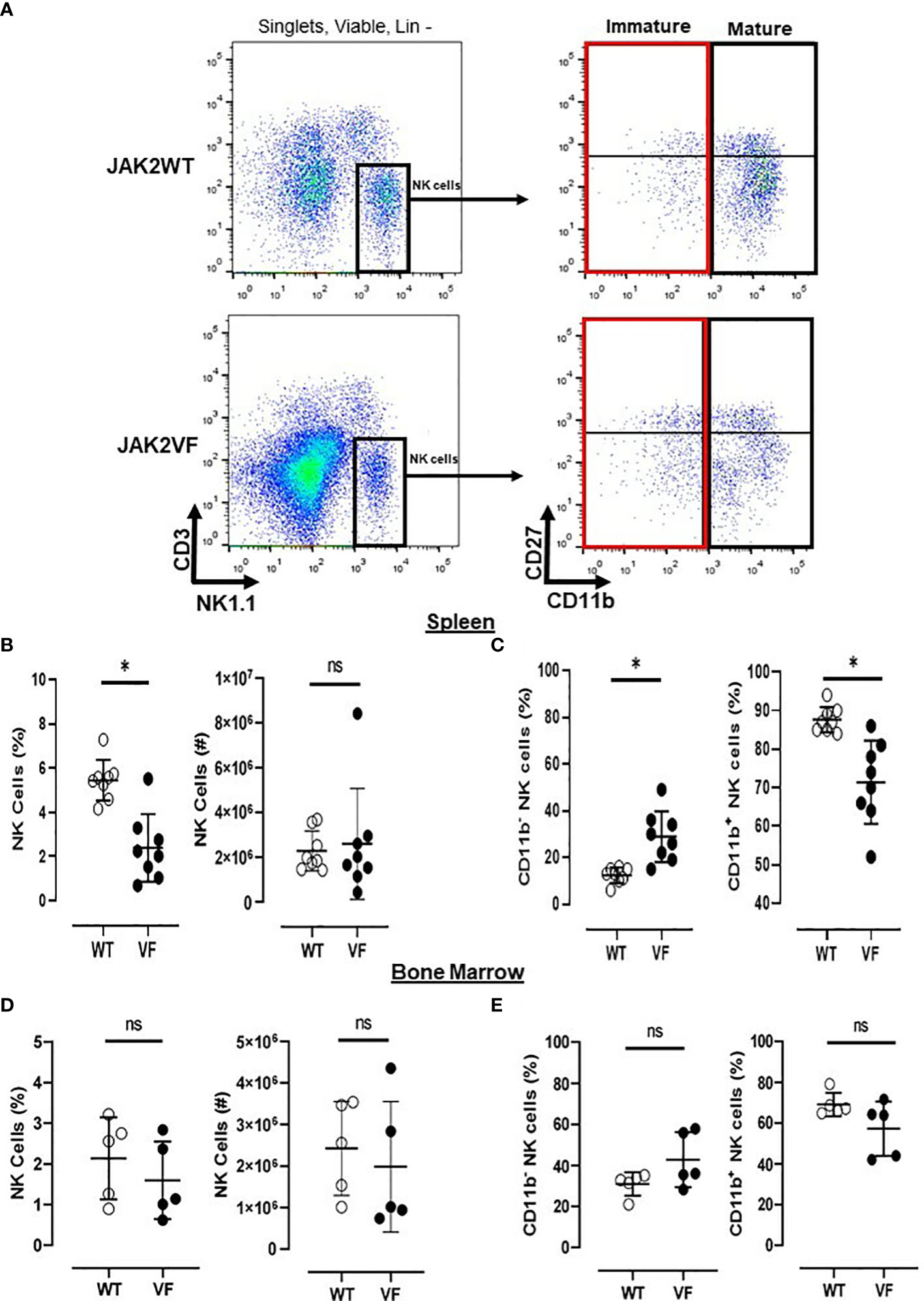 Mature NK cells are low numbered in Jak2V617F mice. (A) Gating strategy to characterize NK cells (Lin neg(−) [TER119−/CD4−/CD8−/CD19−] CD3− NK1.1+) and their maturational subsets, in myeloproliferative neoplasms with JAK2V617F mutation (VF) or not (WT), defined as mature (CD27−CD11b+ and CD27+CD11b+) and immature (CD27−CD11b− and CD27+CD11b−) NK cells. Frequency and absolute numbers of NK cells in (B) spleen and (D) bone marrow. Frequency of immature (CD11b−) and mature (CD11b+) NK cells in (C) spleen and (E) bone marrow. VF, JAK2V617F mutated (n = 13); WT, JAK2 wild-type (n = 13). Error bars indicate the mean (± SEM). NS, not significant (p > 0.05); *p < 0.05; Mann–Whitney tests.