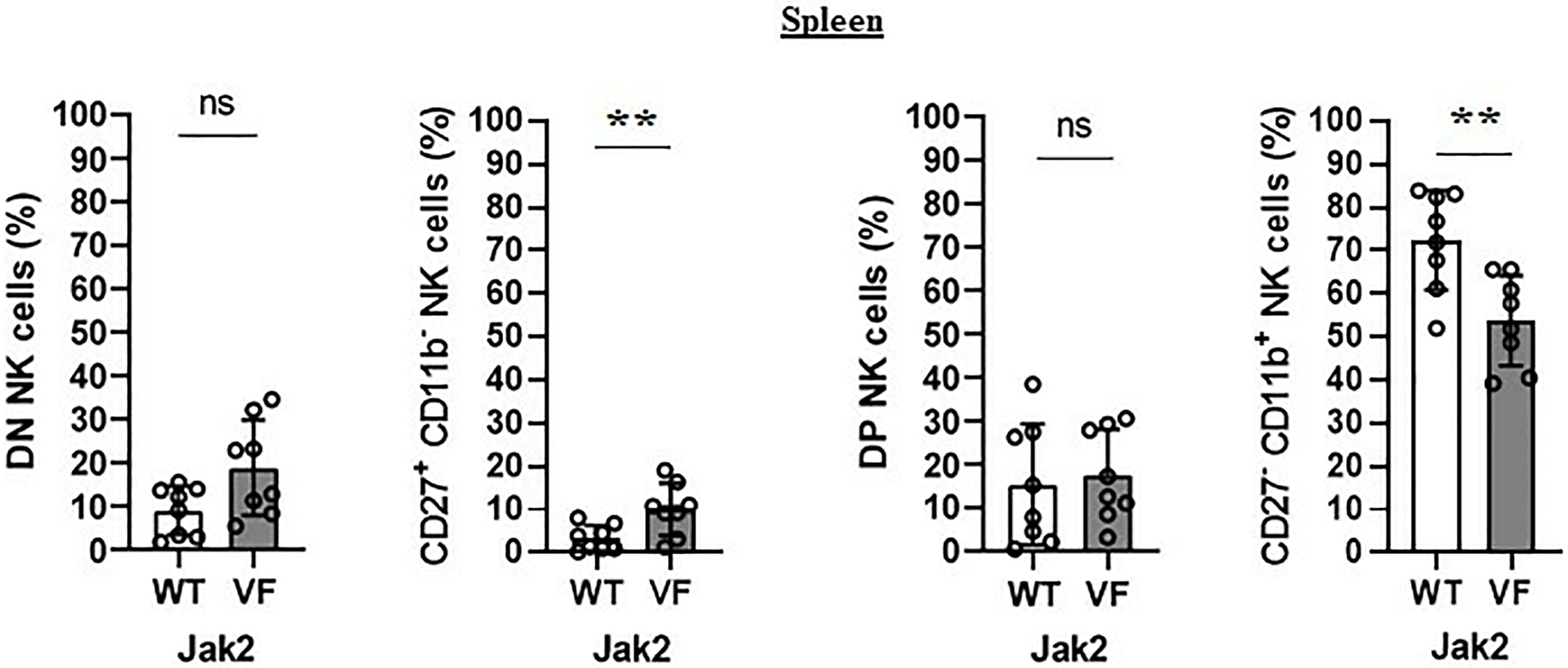The maturation arrest of Jak2V617F murine NK cells is associated with an imbalance between CD27+ and CD11b+ NK subsets. The frequency and absolute number of CD27−CD11b− [double negative (DN)], CD27+CD11b−, CD27+CD11b+ [double positive (DP)], and CD27−CD11b+ NK cells. VF, Jak2V617F mutated (n = 8); WT, Jak2 wild-type (n = 8). Error bars indicate the mean (± SEM). NS, not significant (p > 0.05); **p < 0.01; Mann-Whitney test.
