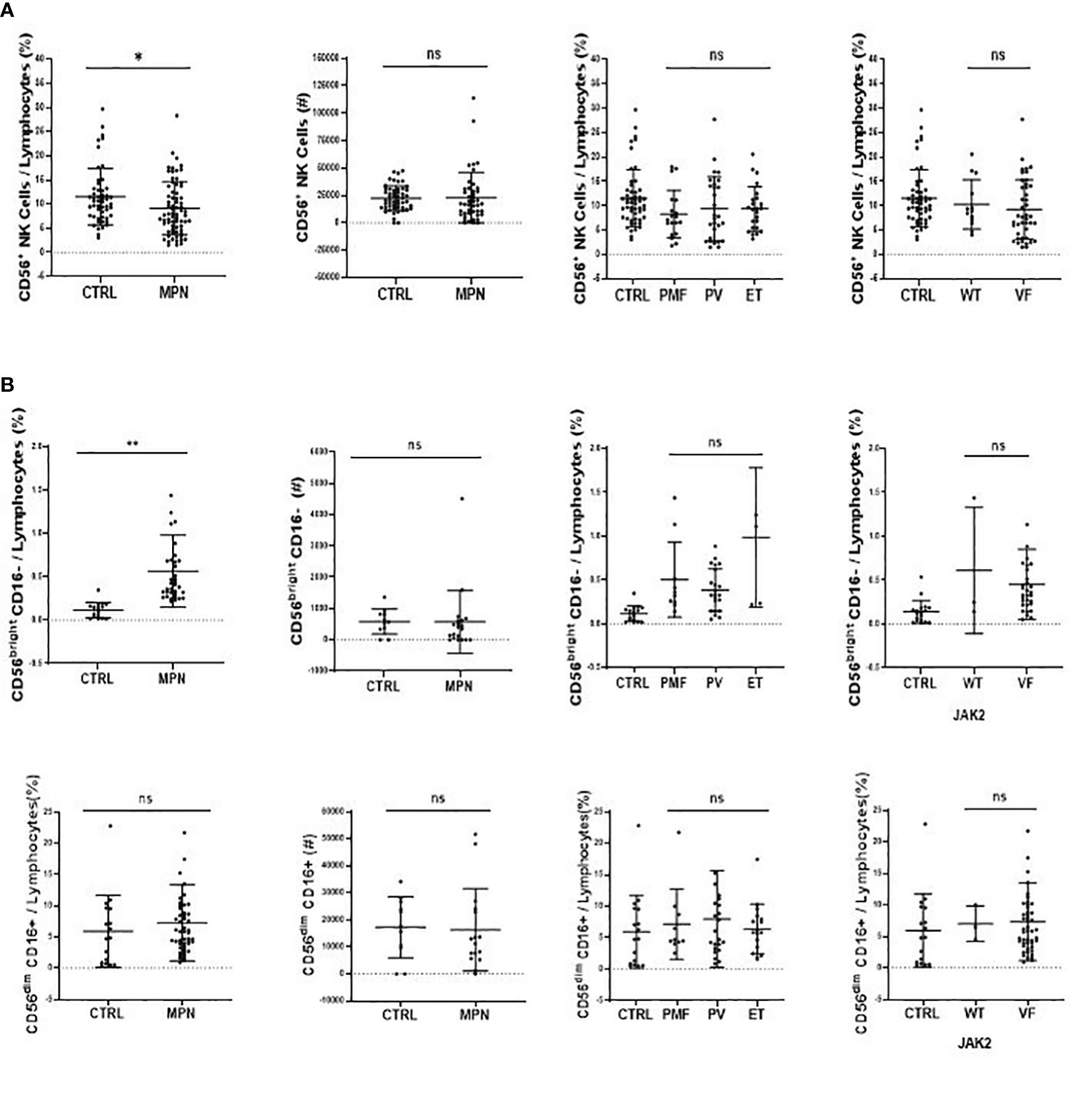 When compared to controls, there was a higher frequency and number of CD56+ NK cells in MPN blood samples among total lymphocytes. This was true for all disease subtypes. It is worth noting that MPN JAK2VF samples presented more CD56+ NK cells than JAK2WT and control samples (Figure 3A).