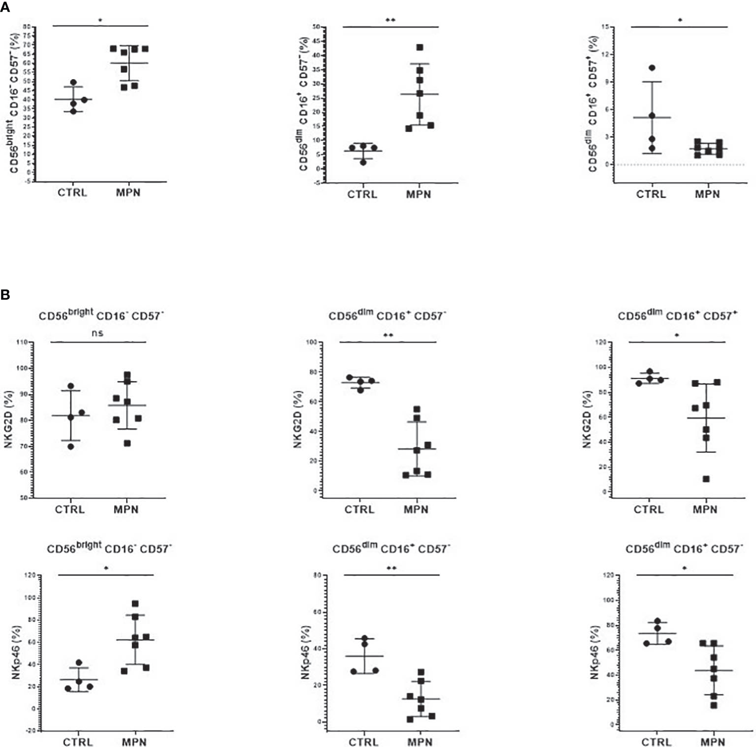 NK cells from MPN patients are phenotypically immature. The frequency of (A) immature (CD56brightCD16−CD57−), intermediate (CD56dimCD16+CD57−), and mature (CD56dim CD16+ CD57+) NK cells; (B) NK-cell activation (NKG2D, NKp46) receptors by CD57 maturation subsets. CTRL, control (n = 4); MPN, myeloproliferative neoplasms (n = 7). Error bars indicate the mean (± SEM). NS, not significant (p > 0.05); *p < 0.05; **p < 0.01; Mann–Whitney and Kruskal–Wallis tests.