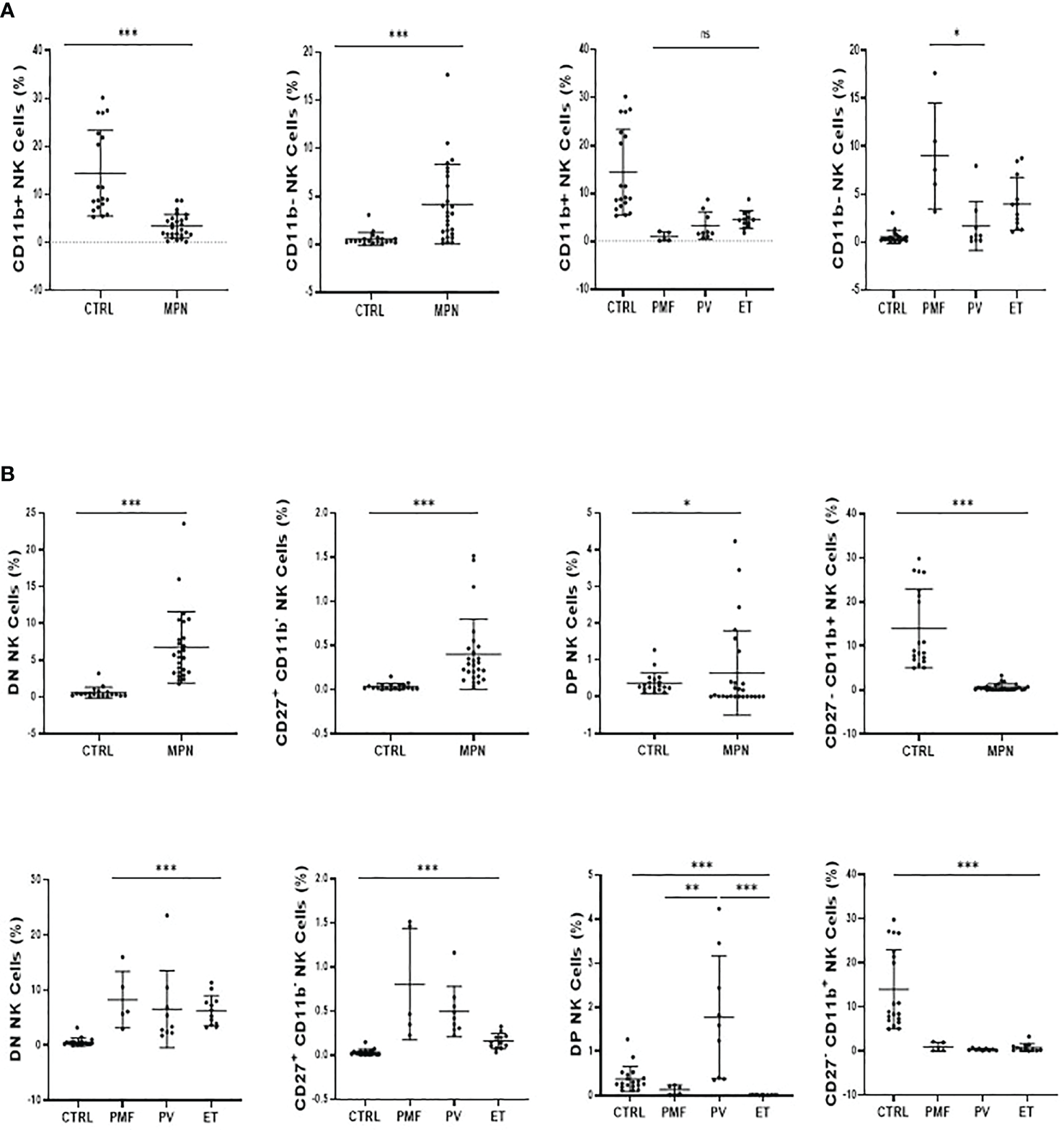 MPN patients show an imbalance between CD11b+ and CD27+ NK-cell subsets. (A) The frequency of CD11b+ (Mature) and CD11b− (Immature) NK cells subsets and; (B) the frequency and absolute number of CD27−CD11b− [double negative (DN)], CD27+CD11b−, CD27+CD11b+ [double positive (DP)], and CD27−CD11b+. NK-cell frequency and maturation profile in myeloproliferative neoplasms according to disease subtype and JAK2V617F mutation (WT or VF). CTRL, control; MPN, myeloproliferative neoplasms (n=26); PV, polycythemia vera (n = 9); ET, essential thrombocythemia (n = 12); PMF, primary myelofibrosis (n = 5). Error bars indicate the mean (± SEM). NS, not significant (p > 0.05); *p < 0.05; **p < 0.01; ***p < 0.001; Mann–Whitney and Kruskal–Wallis tests.