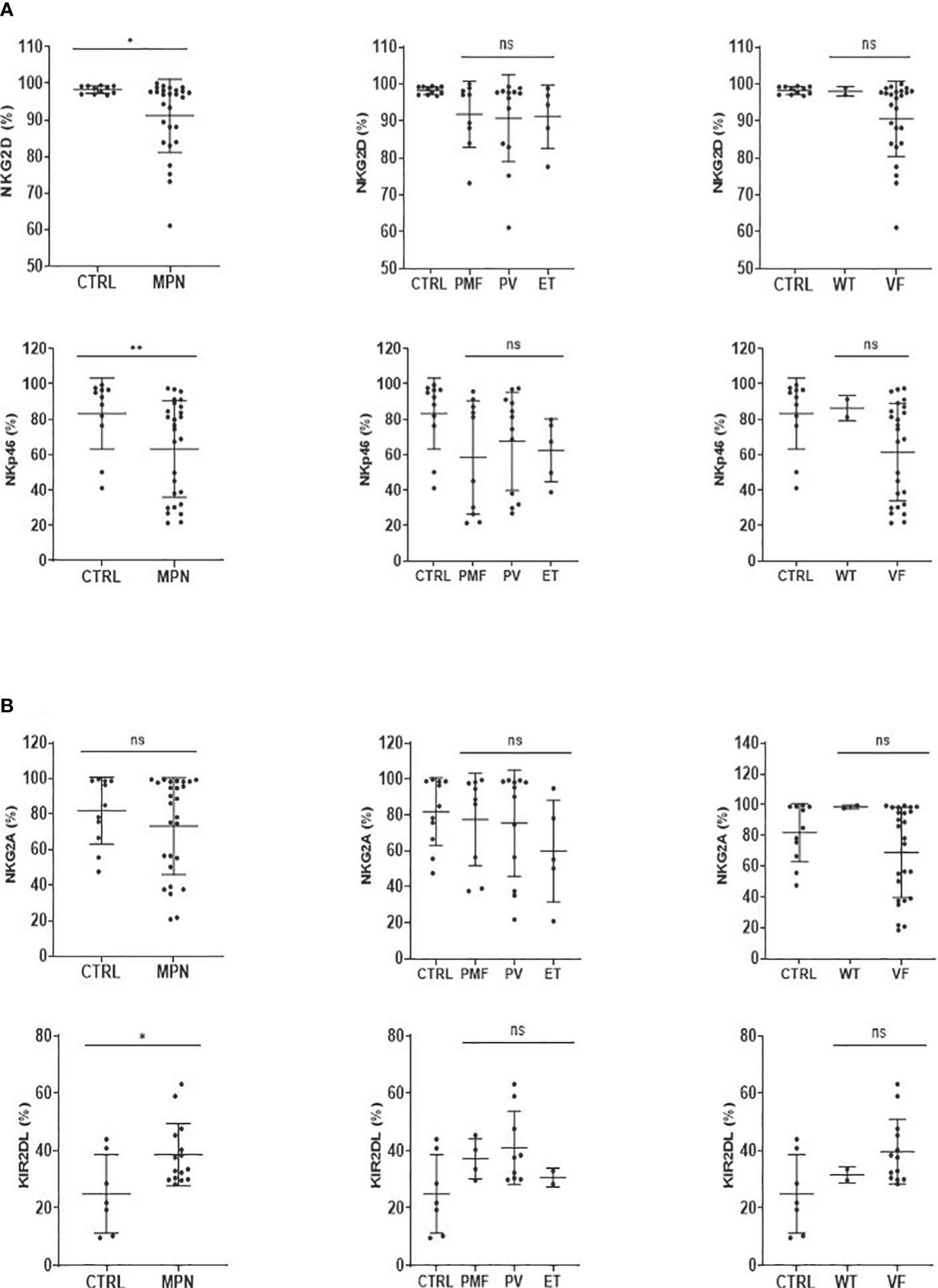 NK-cell activatory and inhibitory receptors are imbalanced in MPN patients. The frequency of (A) NK-cell activation (NKG2D, NKp46) and (B) NK-cell inhibition (NKG2A, KIR2DL) receptor cells in myeloproliferative neoplasms with JAK2V617F mutation (VF) or not (WT). CTRL, control; MPN, myeloproliferative neoplasms (n = 27); PV, polycythemia vera (n = 12); ET, essential thrombocythemia (n = 5); PMF, primary Myelofibrosis (n = 10). Error bars indicate the mean (± SEM). NS, not significant (p > 0.05); *p < 0.05; **p < 0.01; Mann–Whitney and Kruskal–Wallis tests.