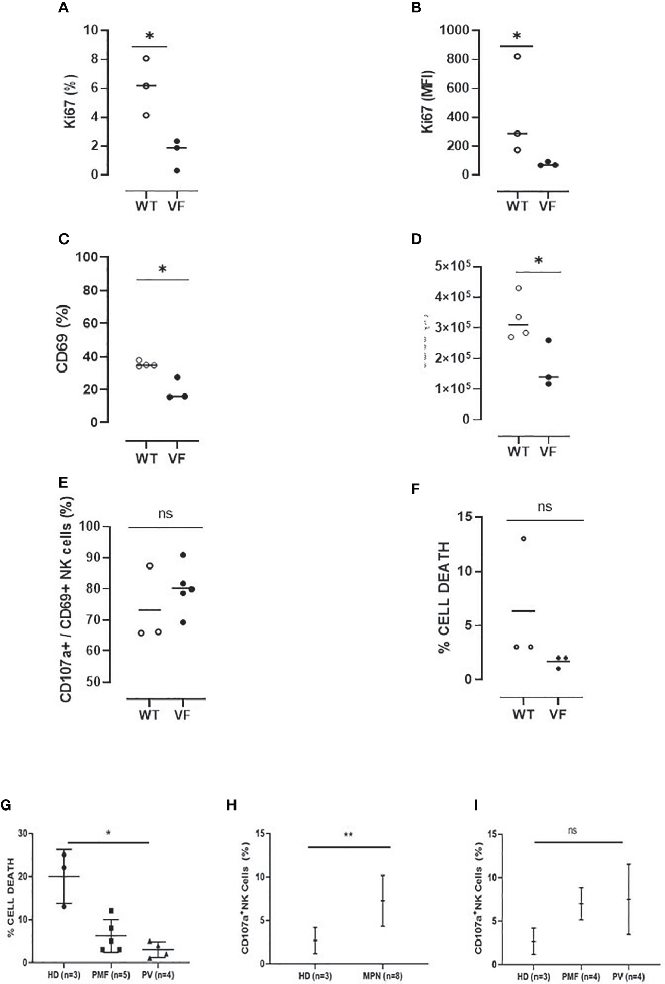 Murine and human NK cells from MPN present defective activation and cytotoxicity as compared to control NK cells. (A) The frequency and (B) mean fluorescence intensity (MFI) of Ki-67 in Jak2WT (n = 4) and Jak2VF (n = 3) NK cells after 72 h of culture in the presence of IL-2. (C) The proportion and (D) number of activated Jak2WT and Jak2VF NK cells (CD69+). (E) The frequency of CD69+ NK cells expressing the degranulation marker CD107a after 3 h of stimulation with YAC-1. (F) The frequency of cell death after YAC-1 stimulation. (G) The frequency of cell death and (H–I) NK degranulation in myeloproliferative neoplasms with JAK2V617F mutation (VF) or not (WT), measured by CD107a expression after stimulation with the K562 target cell. VF, Jak2V617F mutated; WT, Jak2 wild-type; CTRL, control (n = 3); MPN, myeloproliferative neoplasms (n = 9); PV, polycythemia vera (n = 4); PMF, primary myelofibrosis (n = 5). Error bars indicate the mean (± SEM). NS, not significant (p > 0.05); *p < 0.05; **p < 0.01; Mann–Whitney and Kruskal–Wallis tests.