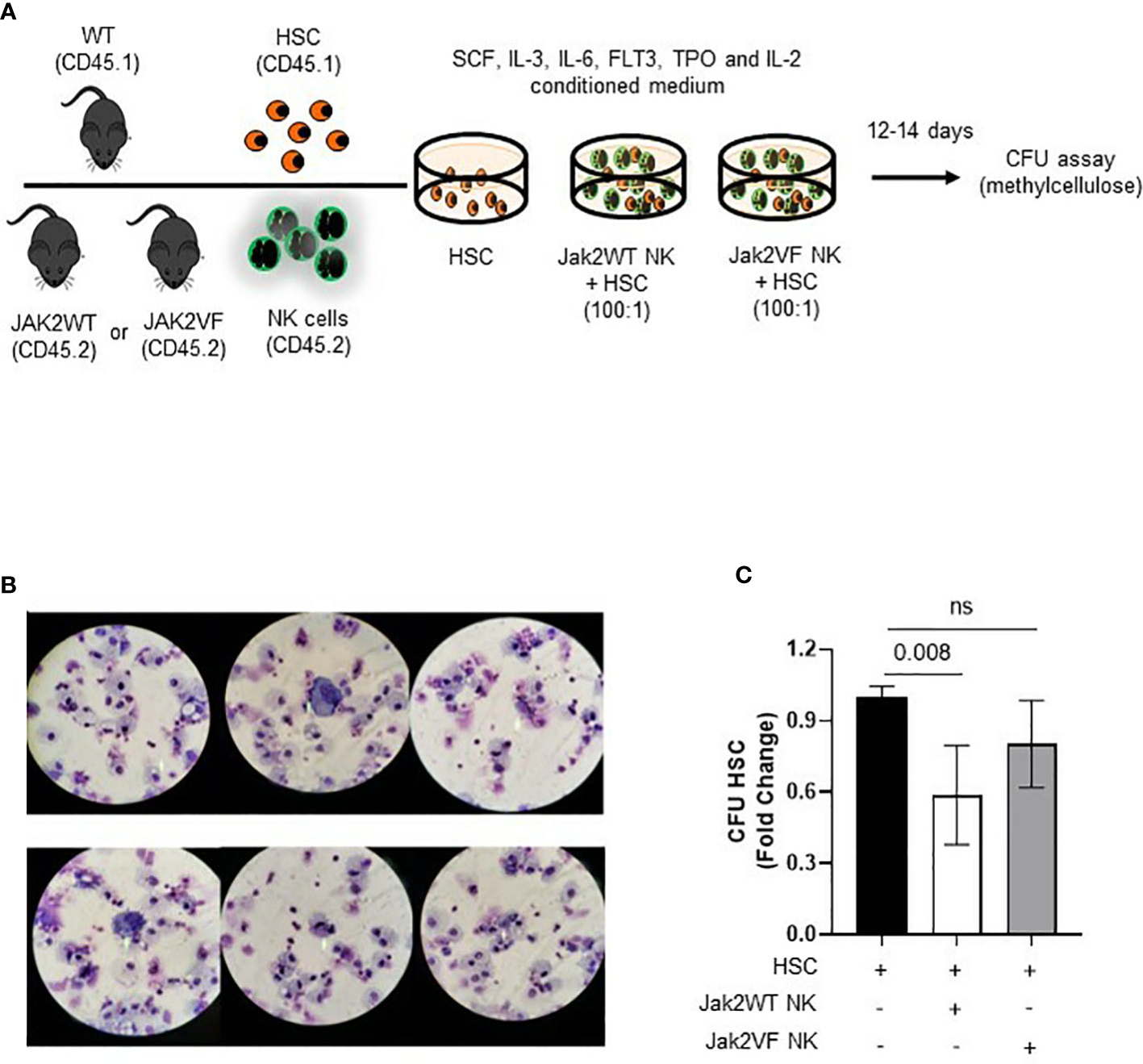 NK cells from Jak2V617F mice are deficient in regulating the differentiation and clonogenic capacity of hematopoietic stem cells (HSC). (A) Schematic figure of the strategy used to study the NK-HSC interaction in culture. (B) Illustrative image of co-culture cytospins showing HSC (LSK SLAM+ cells) differentiation after 12 days of methylcellulose colony assay. The majority of CFU-derived cells corresponded to macrophages and granulocytic progenitors. (C) Graphic representation of the quantification of colony forming units (CFU) expressed as fold change in the following conditions: HSC, Jak2WT NK cells + HSC, Jak2VF NK cells + HSC. VF: Jak2V617F mutated; WT: Jak2 wild-type. CTRL: Control; MPN: myeloproliferative neoplasms. PV: polycythemia vera; ET: essential thrombocythemia; PMF: primary myelofibrosis. Error bars indicate the mean (± SEM). NS, not significant (p < 0.05), Kruskal Wallis test.