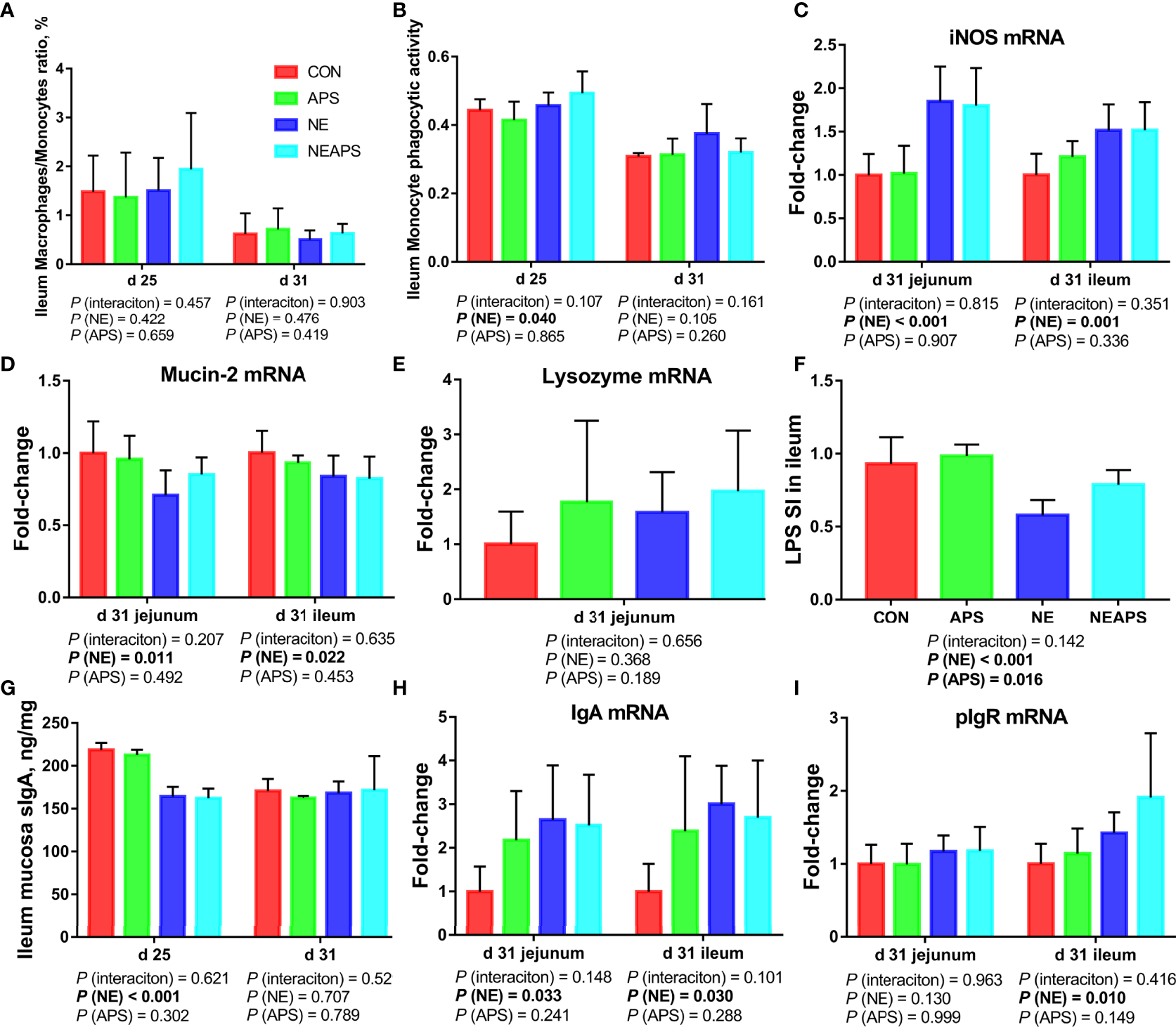 The phagocytic activity levels of peripheral blood and ileal mononuclear lymphocytes were measured by the neutral red assay method. In short, peripheral blood PBMCs were collected, and the number of cells was adjusted to 2×106/ml with RPMI 1640 medium. Then, 100 μL of cell suspension was incubated in a 96-well cell culture plate for 2 hours (with 3 replicate wells), the supernatant was discarded, and 200 μL/well of 0.1% neutral red solution (N299163, Shanghai Aladdin Biochemical Technology Co., Ltd., China) was added, and the cells were further cultured for 2 h. The supernatant was then discarded, and any remaining neutral red was washed away with PBS (3 times). Cell lysate was added at 200 μl/well (ethanol:acetic acid=1:1), kept in the dark at 4°C for 12 h, and the OD value was measured at 550 nm.