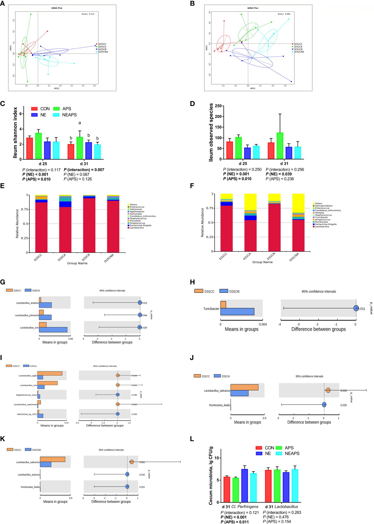 A commercial ELISA kit (Genorise Scientific Inc., Paoli, USA) was used to determine the serum levels of IL-1β, IL-4, IL-10, IL-17 and IFN-γ. According to the instructions, a chicken IgG ELISA kit (E30-104, Bethyl Laboratories Inc., Montgomery, TX, USA) was used to determine the level of IgG in the serum. Serum IgG levels were determined using a commercial ELISA kit (IDEXX Laboratories Inc., Westbrook, Maine, USA) according to the protocol recommended by the manufacturer. Serum NO and lysozyme activities were measured using commercial ELISA kits (A013-2-1; A050-1-1, Nanjing Jiancheng Institute of Bioengineering, Nanjing, China). Ileal mucosa sIgA was measured using a commercial ELISA kit (YM-SQ2632, Shanghai Yuan Mu Biotechnology Co., Ltd., Shanghai, China).