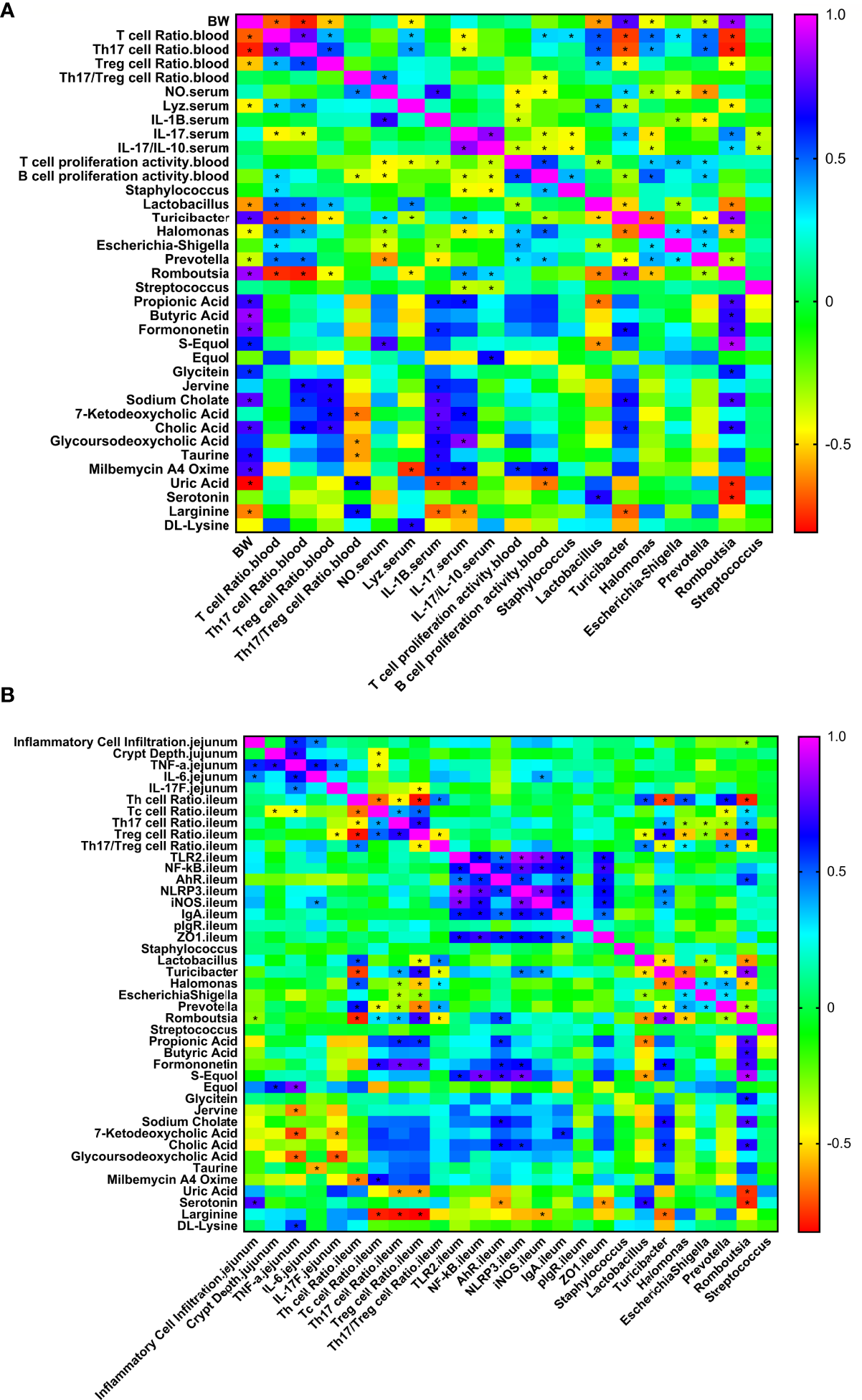 According to reports, gut microbiota and metabolites can regulate the ratio of Th17 and Treg cells and the levels of cytokines in animal intestines (13). The molecular weight of APS will be large, and it is difficult for the endogenous enzymes produced in the animal intestine to completely degrade it into monosaccharides; thus, APS can easily reach the back of the intestine, where it is utilized by microorganisms. Therefore, in addition to its similar structure to LPS, APS can directly regulate the immune function of the host and may also indirectly affect the immune function of the host by regulating the gut microbiota and metabolites. Previous studies have found that adding 200 ppm APS to hen diets increases the relative abundance of caecal Firmicutes and Lactobacteriaceae (14). The addition of γ-irradiated Astragalus polysaccharide (IAPS) to the diet of immunosuppressive broilers significantly increased the caecal microbial α diversity. After adding IAPS to broiler diets, there were lower proportions of Faecalibacterium, Bacteroides, and Butyricicoccus and higher proportions of Ruminococcaceae UCG-014, Negativibacillus, Shuttleworthia, Sellimonas and Lamina RF39_norank (15). The study found that adding 0.5% crude Astragalus to the hen’s diet significantly increased Lactobacillus in faeces and significantly reduced the relative abundance of Romboutsia sp (16).. However, the effects of APS on the ratios of Th17 cells and Tregs in broilers with necrotizing enteritis and the key gut microbes and metabolites that it regulates have not been extensively studied. In view of the ability of APS to regulate the T cell immune response, the importance of T cell immunity in enteritis, and the ability of gut microbiota to regulate T cell subsets, in this study, we explored whether dietary APS supplementation might regulate CD4+ T cell immunity and the gut microbiota and metabolism of broilers with necrotic enteritis. We hypothesize that dietary APS supplementation will regulate the TLRs-NFκB signalling pathway and gut microbiota and metabolism, leading to a dominant position of Tregs, regulating the balance of Th17/Treg, thereby reducing intestinal inflammation and preventing tissue damage.