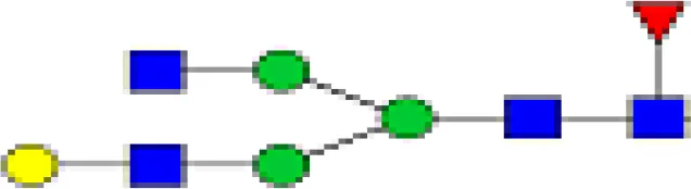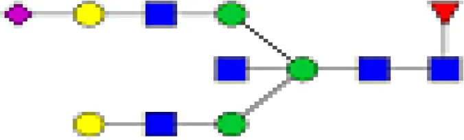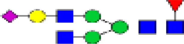 19 different glycan structures were detected in all tested IgG samples. 3 were agalactosylated (G0), 6 were monogalactosylated (G1), 8 were digalactosylated (G2). 13 were fucosylated (F), and 6 afucosylated. 4 glycans were monosialylated (A1), 3 glycans were disialylated (A2) whereas 12 were asialyated. 7 glycans had a bisecting GlcNac arms (b...).