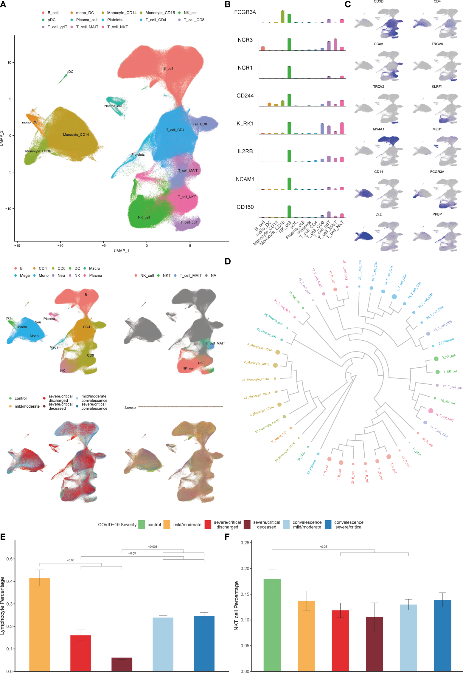 Single-cell transcriptional profiling of PBMCs in COVID-19. (A) Integration analysis results of patients with COVID-19 and controls showing UMAP visualization, including integration analysis result of 13 major cell clusters annotated (top), the cell clustering results in origin data (middle left), the result of NKT cell clusters annotated by SingleR (middle right), the result of patients with COVID-19 and healthy controls (bottom left), the result of PBMCs samples with no batch effect observed (bottom right). (B) Expression of NK-associated genes, including CD16 (FCGR3A), NKP30 (NCR3), NKP46 (NCR1), 2B4 (CD244), NKG2D (KLRK1), CD122 (IL2RB), CD56 (NCAM1) and CD160 in cell clusters. (C) Known cell markers used to identify PBMCs cell types. (D) The result of cell clusters showing by dendrogram (E) Percentage of lymphocytes in COVID-19 patients derived by the routine blood test. (F) Percentage of NKT cells in COVID-19 patients and controls derived by single cell datasets. (Wilcoxon test).