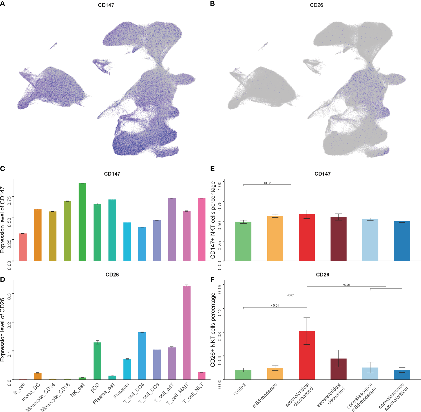 The expression levels of CD147 and CD26 in NKT cells. (A, B) Expression of CD147 and CD26 in PBMCs showing UMAP visualization. (C, D) Expression of CD147 and CD26 in PBMC subsets. (E, F) Percentage of CD147+ NKT cells and CD26+ NKT cells in COVID-19 patients and controls. (Wilcoxon test).