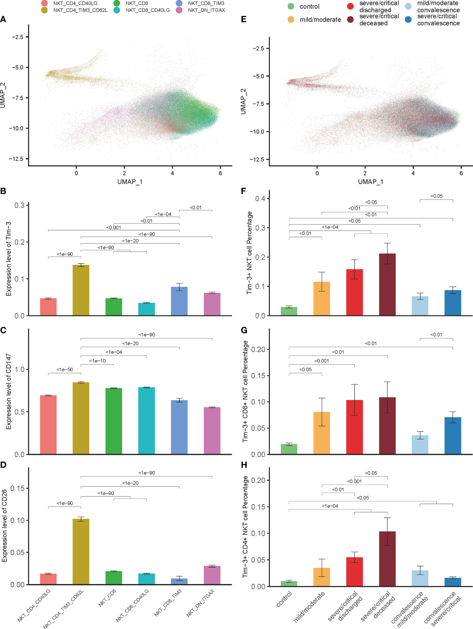 Tim-3 expression in NKT cells associated with disease severity and outcome in COVID-19 patients. (A) Integration analysis results of NKT cells in COVID-19 patients and controls with 6 NKT cell clusters. (B) Expression of Tim-3 in 6 NKT cell clusters. (C, D) Expression of CD147 and CD26 in 6 NKT cell clusters. (E) Integration analysis results of NKT cells in COVID-19 patients and controls with no batch effect between samples. (F–H) Percentage of Tim-3+ NKT cells, Tim-3+ CD8+ NKT cells and Tim-3+ CD4+ NKT cells in COVID-19 patients and controls. (Wilcoxon test).
