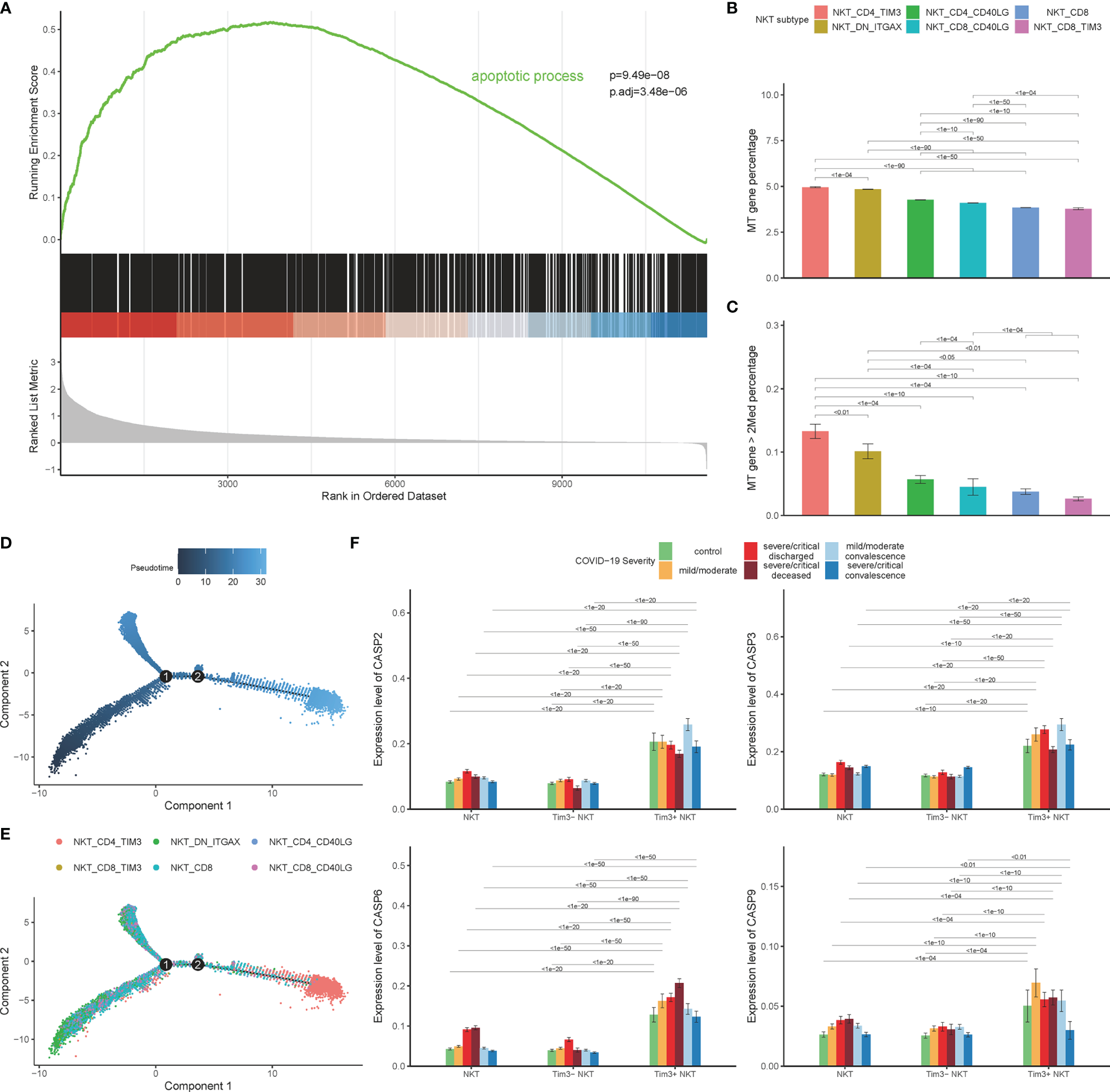 Tim-3 expression associated with NKT cells apoptosis in COVID-19. (A) Gene set enrichment analysis (GSEA) result of apoptotic process pathway. (B) Expression of mitochondrial genes on 6 NKT cell clusters. (C) Percentage of mitochondrial genes highly expressed NKT cells on 6 NKT cell clusters. (D, E) Pseudo-time analysis results. (F) Expressions of caspase genes on Tim-3+ NKT cells and Tim-3- NKT cells in COVID-19 patients and controls. (Wilcoxon test).