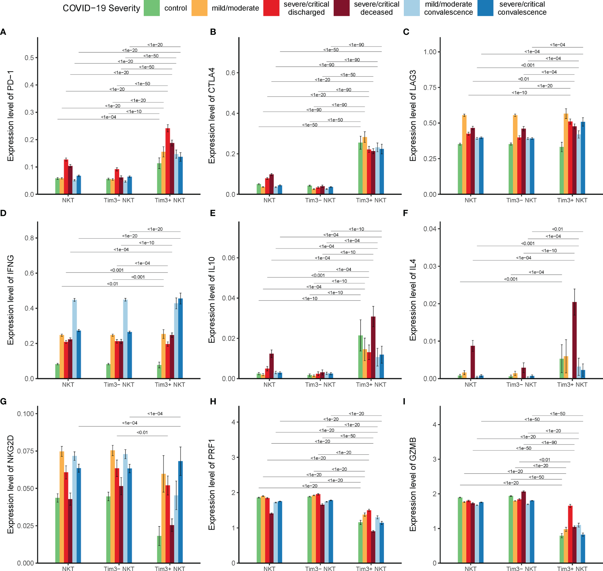 Tim-3 expression and functional status of NKT cells in COVID-19. (A–C) Expressions of co-inhibitory receptor genes PD-1, CTLA4, and LAG3 on Tim-3+ NKT cells and Tim-3- NKT cells in COVID-19 patients and controls. (D–F) Expressions of cytokine genes IFN-γ, IL-10, and IL-4 on Tim-3+ NKT cells and Tim-3- NKT cells in COVID-19 patients and controls. (G–I) Expressions of cytotoxicity related genes NKG2D, PRF1, and GZMB on Tim-3+ NKT cells and Tim-3- NKT cells in COVID-19 patients and controls. (Wilcoxon test).