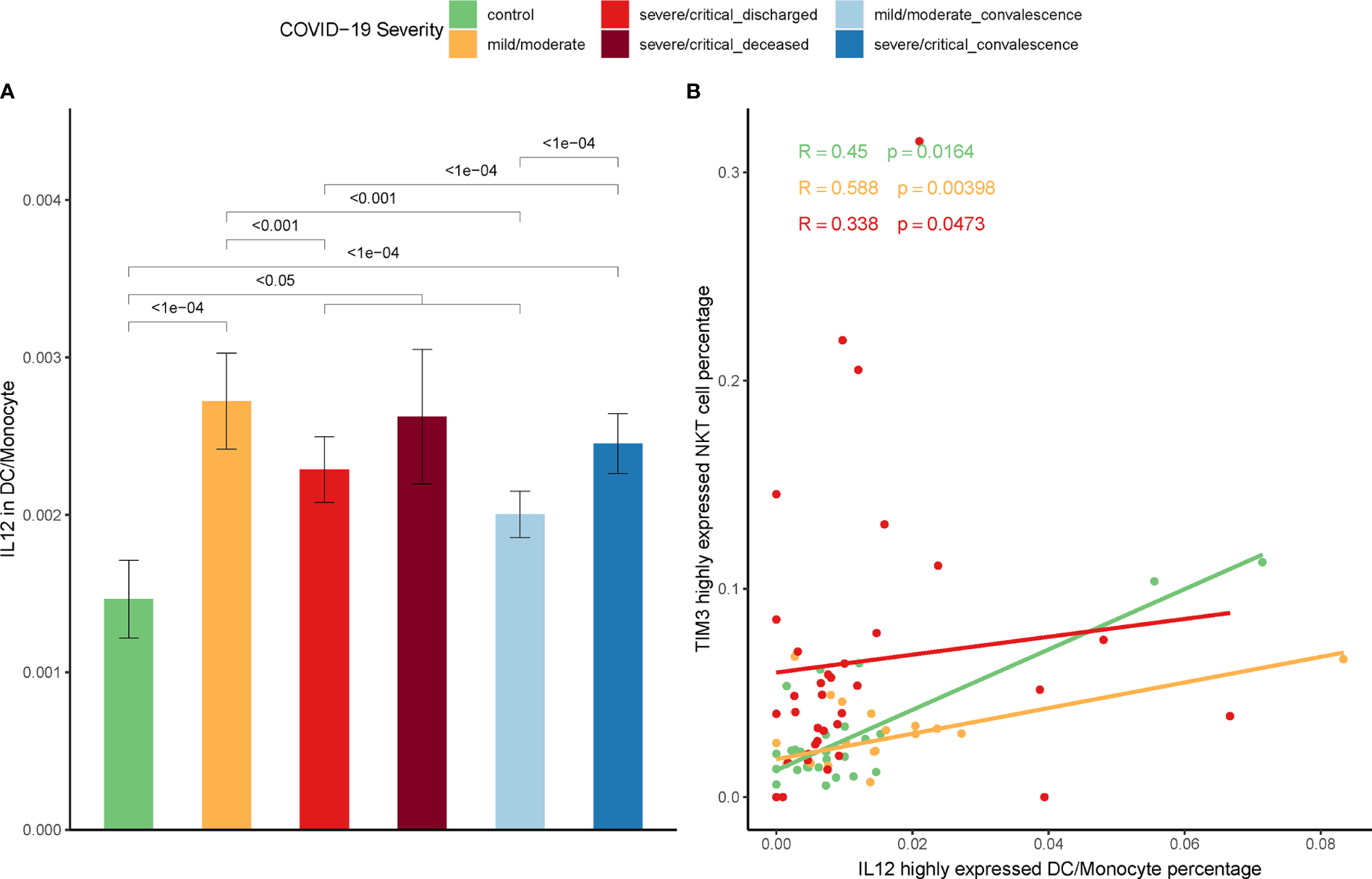 Our previous work on the mice model indicated that IL-12 secreted by stimulated DCs induced Tim-3 over-expression on NKT cells (39). To ascertain this relationship between IL-12 secretion and Tim-3 over-expression in COVID-19, IL-12 expression on DCs and monocytes were firstly assayed. In line with the increase expression of Tim-3 in NKT cells in COVID-19 patients, the IL-12 expression in DCs/monocytes was significantly higher in patients than controls (Figure 6A). Additionally, the proportion of DCs/monocytes with high IL-12 expression was positively correlated with the proportion of NKT cells with high expression of Tim-3 in discharged COVID-19 patients. The Spearman correlation coefficient R=0.588, p=0.00398 in mild/moderate patients, and R=0.338, p=0.0473 in severe/critical patients was shown in Figure 6B.