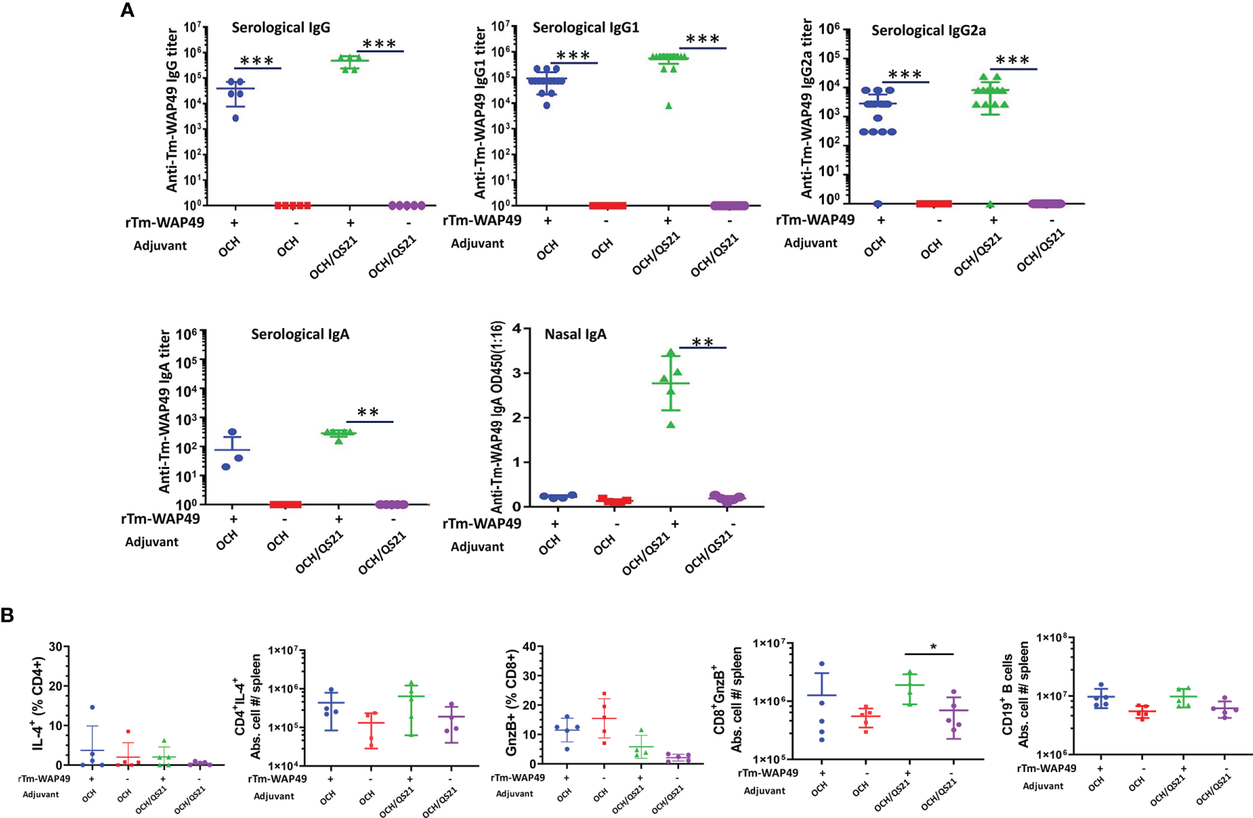 Pre-challenge antibody responses and induction of cellular immune responses by the Tm-WAP vaccine in mice during the first vaccine trial. (A) Sera and nasal lavage liquid were collected from mice intranasally immunized with rTm-WAP49 formulated with OCH, or OCH/QS-21; antigen-specific IgG, IgG1, IgG2a, and IgA were measured in sera and secretory IgA measured in nasal lavage liquid by ELISA. (B) For cellular responses, groups of mice were euthanized pre-challenge, and spleen cells were analyzed by multiparametric flow cytometry. The total viable cells per spleen were enumerated by Trypan blue dye exclusion, and the absolute cell numbers for each lymphocyte population per mouse spleen were calculated based on the frequency of respective cell subsets and the total number of viable cells per spleen (spleen cellularity). Frequencies and absolute cell numbers of IL-4 producing CD4 T cells, granzyme B (GnzB)-expressing CD8 T cells, and absolute cell numbers of B cells in spleens of mice are shown. The data represent mean ± SD from n = 4–5 mice per group. *p < 0.05, **p < 0.01, ***p < 0.001.