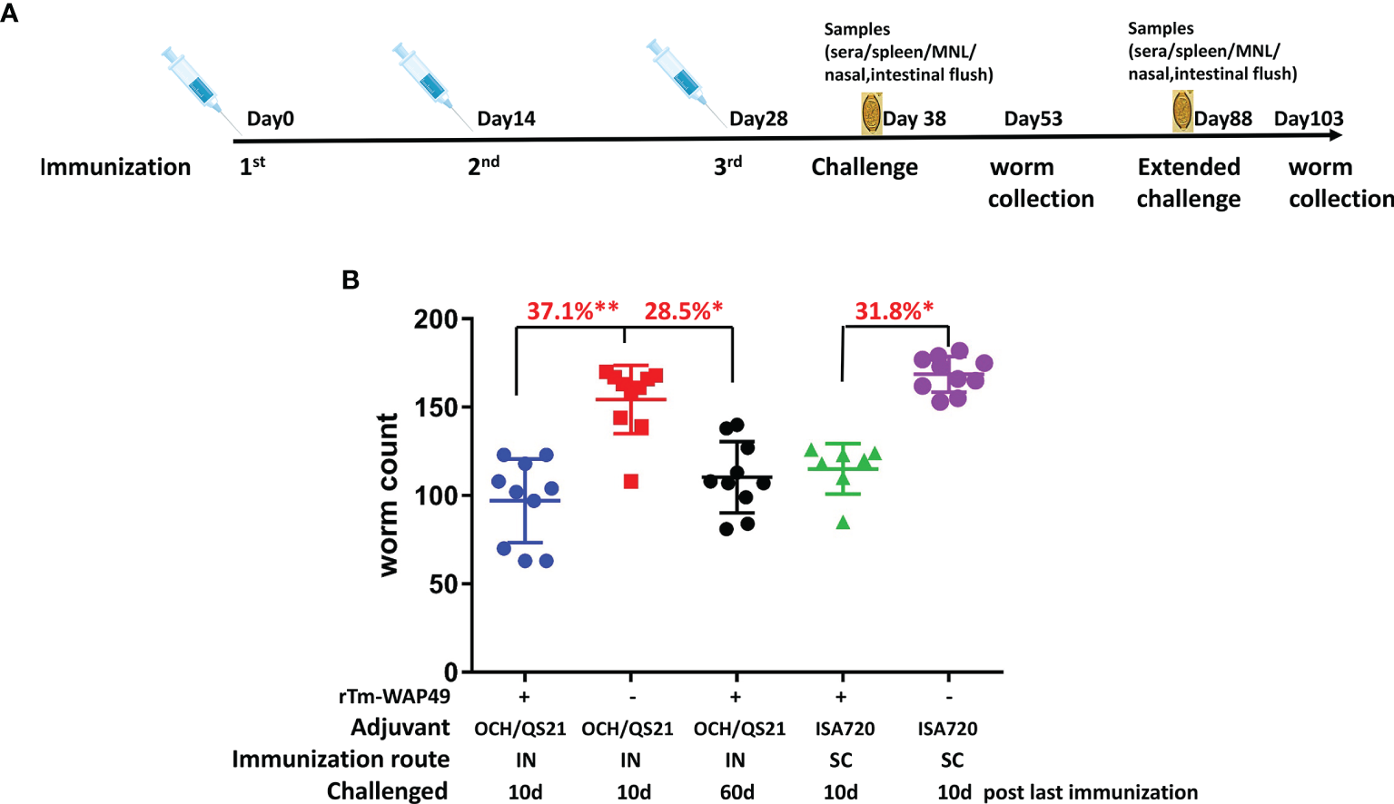 The first vaccine trial employing rTm-WAP49 intranasal immunization against T. muris infective egg challenge. (A) Immunization regime. (B) Worm reduction in the cecum 15 days post challenge with 300 T. muris embryonated eggs. *p < 0.05.