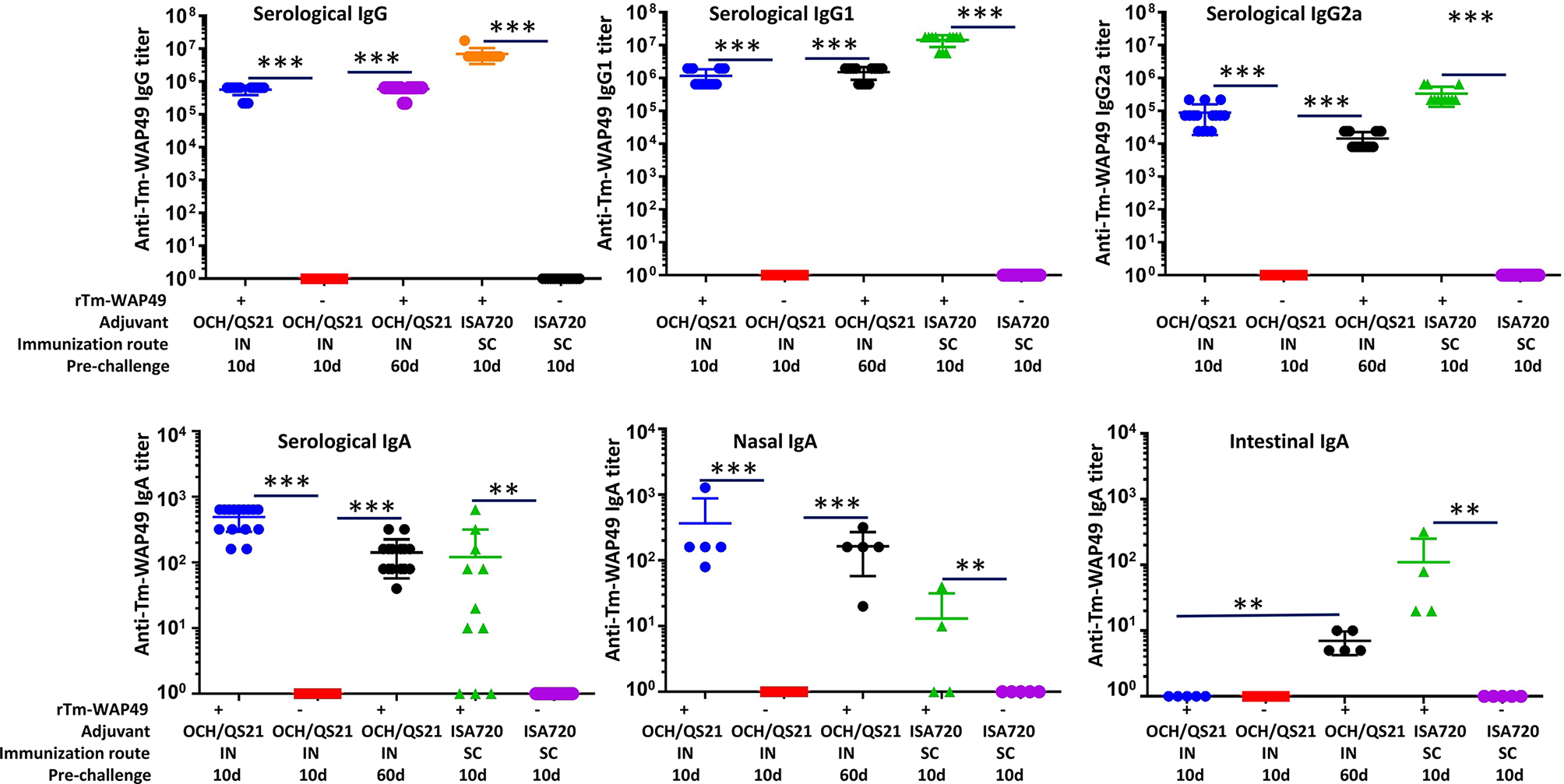Pre-challenge humoral immune responses in mice from the second vaccine trial. Sera and nasal flush liquid were collected from mice intranasally immunized with rTm-WAP49 formulated with OCH/QS-21, or subcutaneously with rTm-WAP49 formulated with ISA720; antigen-specific IgG, IgG1, IgG2a, and IgA were measured in sera and secretory IgA measured in nasal flush liquid by ELISA. IN, intranasal immunization; SC, subcutaneous immunization. **p < 0.01, ***p < 0.001.