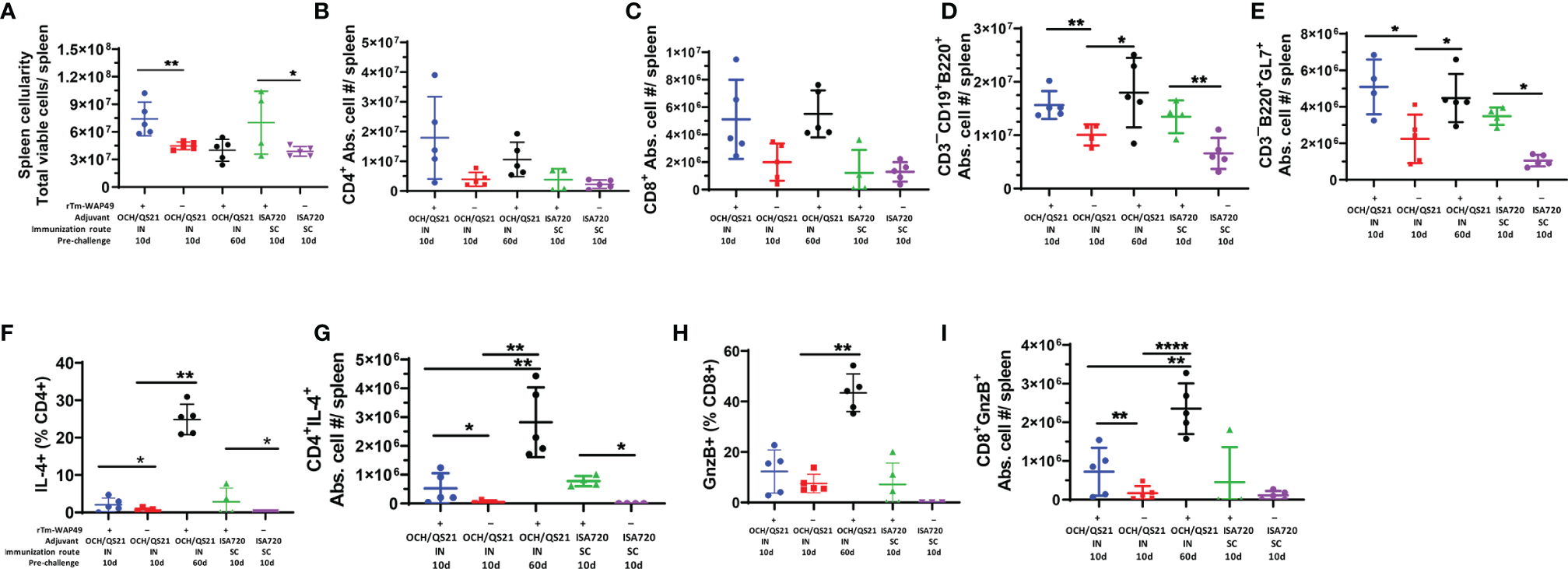 In the first vaccine trial, along with humoral immune responses, the induction of functional T cell responses was analyzed in mice immunized by the intranasal route with Tm-WAP49 formulated with OCH or OCH/QS-21 adjuvants (Figure 3B). The data indicated that CD4 T cells producing IL-4 and total B cell populations were relatively higher in Tm-WAP49 formulated with OCH or OCH/QS-21 compared to control groups of mice immunized with adjuvants only. Moreover, we observed that cytotoxic CD8 T cells (CTLs) expressing granzyme B were significantly increased in Tm-WAP49 formulated with OCH/QS-21 compared to adjuvants only controls. A more extensive analysis of cellular immune responses employing multiple phenotypic and functional markers was performed in the second vaccine trial. Significant increases in total spleen cellularity were observed in the vaccine-treated groups as opposed to their respective adjuvant controls at day 10 (Figure 5A). Multiparametric flow cytometry analyses showed that there were no significant differences in the absolute cell numbers for total CD4 (Figure 5B) and CD8 T cells (Figure 5C) induced by vaccination as compared to adjuvant controls. However, absolute numbers of CD3–CD19+B220+ total B cells (Figure 5D) and germinal center B cell subsets expressing specific marker GL-7 on the surface (Figure 5E) were significantly increased in the vaccine groups at day 10 compared to adjuvant controls. Moreover, frequencies, as well as absolute cell numbers of functional subsets of CD4 T cells producing IL-4 (Figures 5F, G), were significantly upregulated in vaccine-treated groups. The frequencies of cytotoxic CD8 T cells expressing granzyme B were slightly higher with WAP49 + OCH/QS-21 intranasal vaccination compared to adjuvant control (Figure 5H). When the frequencies were converted to absolute cell numbers, there was a significant increase in these functional subsets with WAP49 + OCH/QS-21 intranasal vaccination compared to adjuvant control vaccination at day 10 (Figure 5I). Interestingly, these increases in functional CD4 and CD8 T cell responses were not only sustained but further enhanced by day 60 in mice vaccinated with rTm-WAP49 + OCH/QS-21 (Figures 5D–I). Unlike the rTm-WAP49 + OCH/QS-21 intranasal vaccine, the rTm-WAP49 + ISA720 SC vaccine significantly induced functional CD4 response (CD4+IL-4+), but not functional CD8 response (CD8+GnzB+) relative to ISA720 adjuvant control (Figures 5H, I).