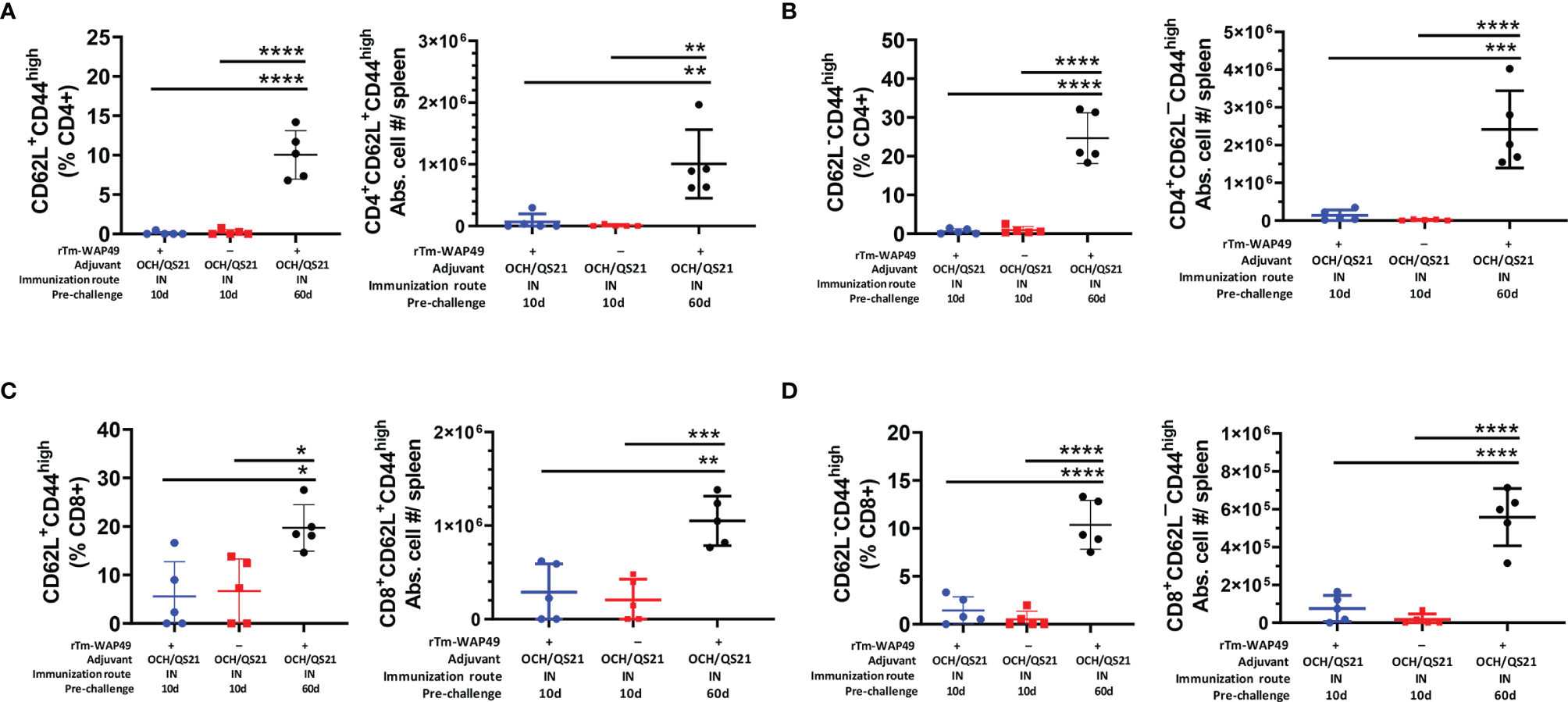 Importantly, in agreement with the observed humoral immune responses (Figures 2A, 4), the total frequencies of B cells (CD19+B220+) as well as the functional germinal center B cell subsets (B220+GL7+), important for antibody production, were significantly higher in mice receiving the intranasal vaccine formulated with OCH/QS-21 or after the systemic subcutaneous immunogen formulated with ISA720 (Figures 5D, E). The enhanced total B cell and functional germinal center B cell responses were also found to be sustained at day 60 in mice receiving intranasal rTm-WAP49 + OCH/QS-21 vaccine formulation. We also observed robust induction of central memory (CD62L+C44High) CD4 (Figure 6A) and CD8 (Figure 6C) T cells as well as effector memory (CD62L¯CD44High) subsets of CD4 (Figure 6B) and CD8 (Figure 6D) T cells 60 days after intranasal vaccination with rTm-WAP49 + OCH/QS-21.