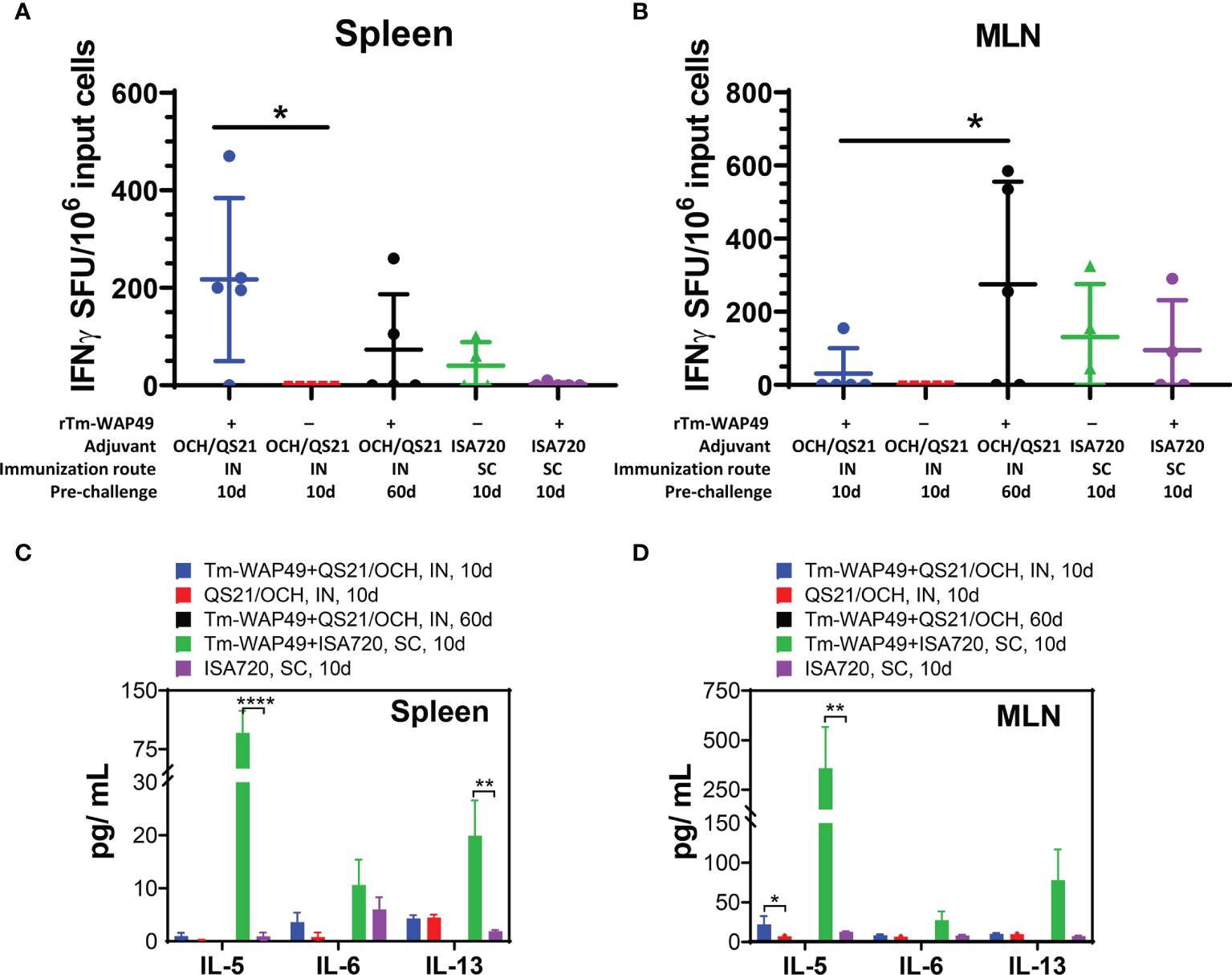Mucosal immunization with the Tm-WAP vaccine induces antigen-specific T cells and cytokine secretion. Pre-challenge spleen and mesenteric lymph node (MLN) cells were stimulated with TmWAP49 antigen or media in triplicate wells for 48 h in ELISPOT plates, developed, and analyzed for IFN-γ+ spots. The antigen-specific IFN-γ spot-forming units (SFU) after subtracting spots from media control wells for each sample are shown for spleen (A) and MLN (B). The data represent mean ± SD from n = 4–5 mice per group. Aliquots of 48-h culture supernatants were analyzed for various cytokines by multiplex Luminex assay. The antigen-specific secretion of cytokines is shown for spleen (C) and MLN (D) after subtracting the values for media controls for each sample. The data represent mean ± SD from n = 4–5 mice per group. IN, intranasal immunization; SC, subcutaneous immunization. *p < 0.05, **p < 0.0021, ****p < 0.0001.