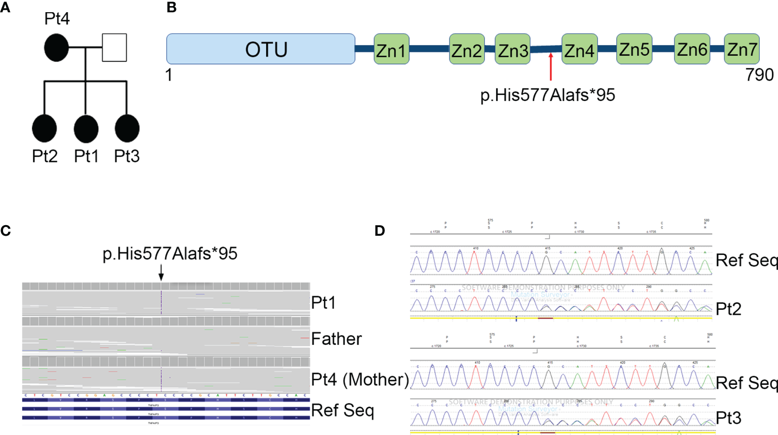 Next generation sequencing (NGS) analysis was performed first on Pt1 and her parents. A heterozygous c.1727dupC variant in the TNFAIP3 gene (NM_006290), introducing the frameshift variant p.His577Alafs*95, was identified in the Pt1 and her mother (Pt 4) (Figures 1B, C). The variant, located between the zinc finger domains 3 and 4 of the A20 protein (Figure 1B), was predicted to be damaging by in silico tools, since it introduces a premature stop codon leading to a putative haploinsufficiency of the protein. The same frameshift mutation was also present in the two sisters, Pt2 and Pt3, of our proband, as confirmed by Sanger sequencing (Figure 1D).