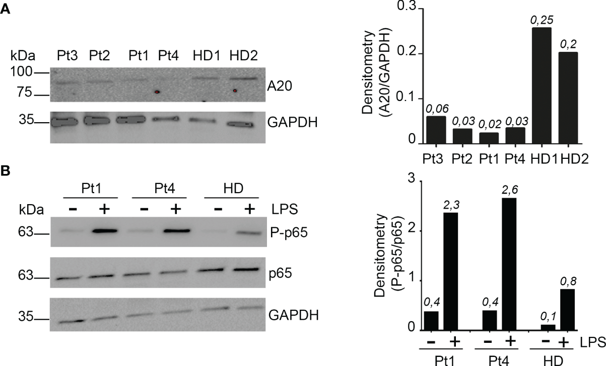 Since A20 is a known critical negative regulator of NF-kB signaling (8), we investigated if A20 decreased levels were associated with a dysregulation of NF-kB activation, by assessing the phosphorylation status of the p65 NF-kB subunit (Serine 536, S536) in unstimulated and LPS-stimulated PBMCs from Pt1 and Pt4. Higher p65 NF-kB (S536) phosphorylation levels were detected in PBMCs isolated from these patients compared to healthy donors (HD), both in unstimulated and LPS-stimulated cells (Figure 2B).