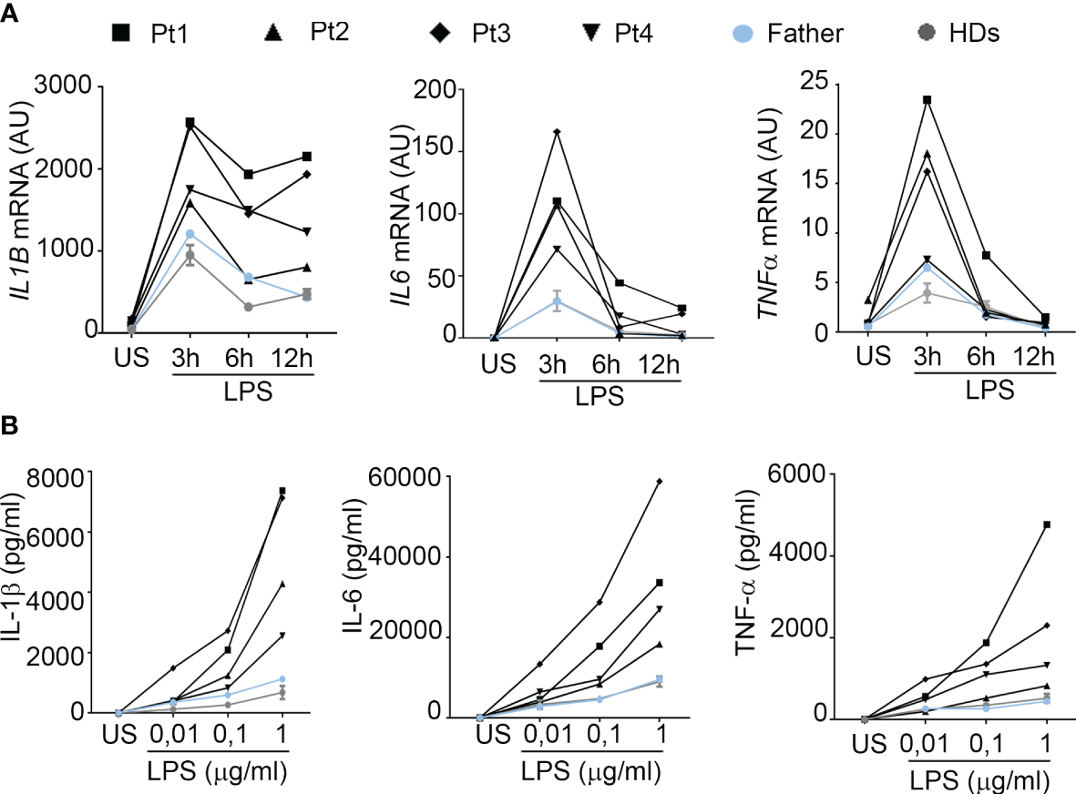 PBMCs from HA20 patients express markedly higher levels of pro-inflammatory cytokines. (A) The mRNA expression levels of IL1B, IL6 and TNF were evaluated by qPCR analysis in PBMCs from patients (Pt1-4), a relative (father) and 2 healthy donors (HDs) unstimulated (US) or stimulated for the indicated hours h with 0.01 μg/ml of LPS. Results were obtained after normalization with the housekeeping gene HPRT1 and were expressed as arbitrary units (AU). (B) PBMCs isolated from patients (Pt1-4), a relative (father) and 4 healthy donors (HDs) were unstimulated (US) or stimulated for 24 hours with 0.01, 0.1 and 1 μg/ml of LPS and IL-1β, IL-6 and TNF-α protein levels were measured in the conditioned media by ELISA.