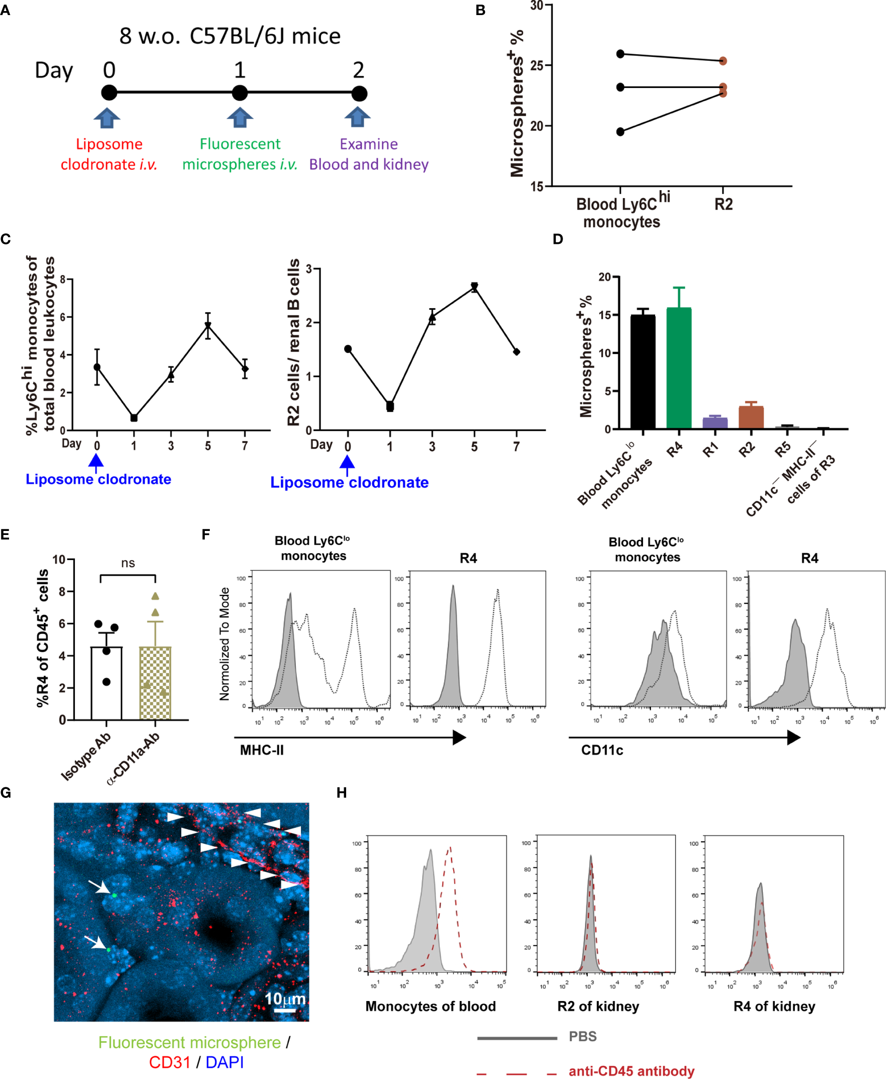 Defining the intrarenal monocyte subsets. (A) Working diagram of labeling and tracing classical monocytes. (B) The labeling rates of fluorescent microspheres in blood classical monocytes and renal R2 cells. Each dot represents the data derived from one mouse. (C) The depletion and recovery patterns of blood classical monocytes and renal R2 cells after liposome clodronate treatment (n=3-6 per group). (D) The labeling rates of fluorescent microspheres in blood nonclassical monocytes and the indicated renal mononuclear phagocyte subsets (n=3 per group). (E) One hour prior to perfusion, mice were i.v. treated with either an anti-CD11a antibody or an isotype control antibody. The yields of R4 cells were compared after extracting the kidneys. ns, not significant. (F) Expression of MHC-II and CD11c on blood Ly6Clo nonclassical monocytes and on renal R4 cells were compared. The shaded is isotype antibody staining (representative of n=4 per group). Data were derived from 2 or more independent experiments. (G) A confocal image of microsphere-labeled nonclassical monocytes (arrow) in the interstitium of kidney. Arrowheads indicate the contour of a blood vessel. (H) The CD45 labeling efficiency of total blood monocytes and renal R2 and R4 monocytic cells after a fluorescently labeled anti-CD45 antibody was given i.v. 2 min before euthanasia (representative of n=3 per group). Data are representative of at least two independent experiments. All error bars indicate mean ± SEM.