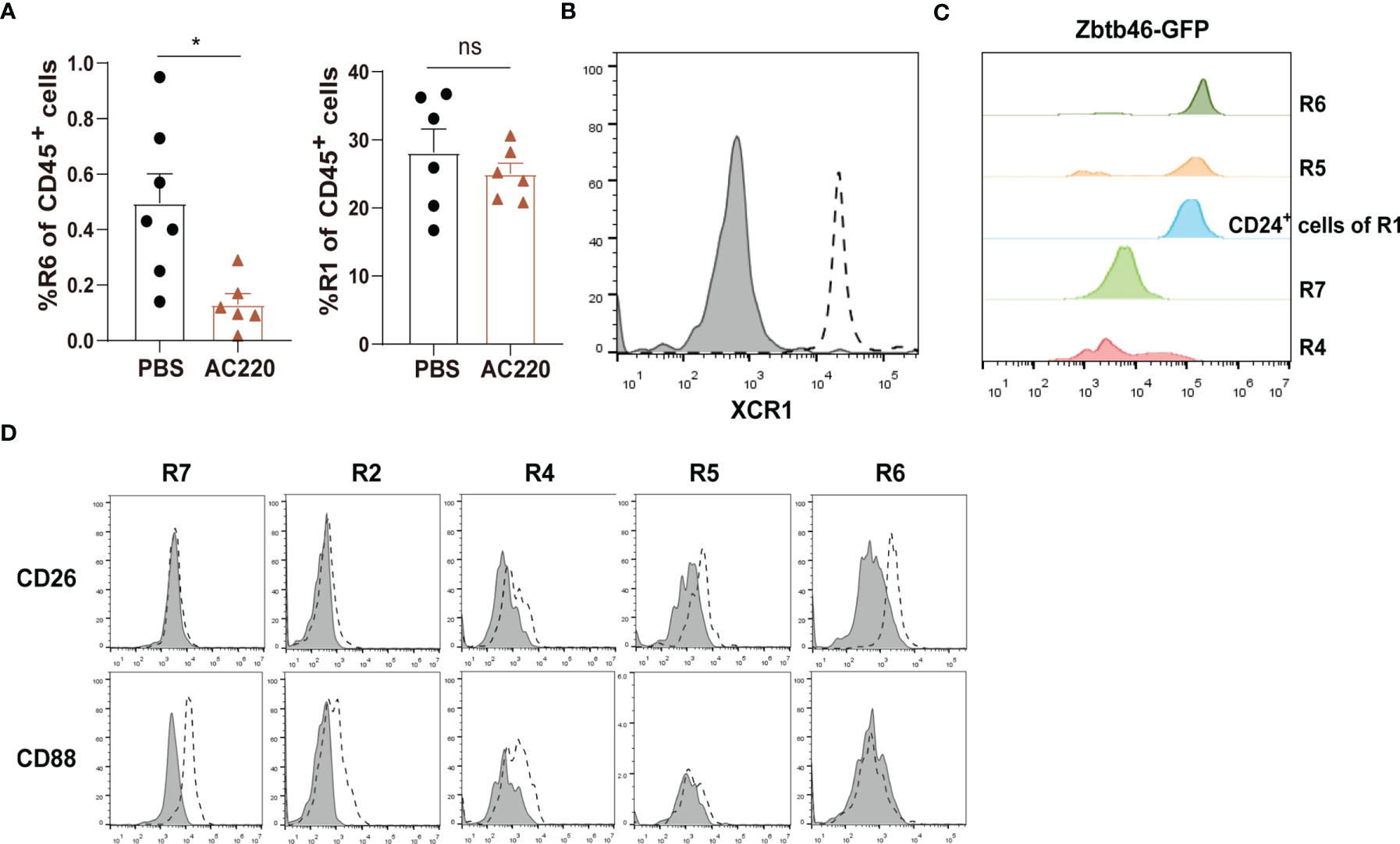 Distinguishing macrophages from classical DCs in the kidney (A) Treating C57BL/6 mice with Flt3 inhibitor AC220 for 2 weeks significantly reduced the cell number of R6 cDC1s but had little impact on R1 cells. *P < 0.05; ns: not significant. P values were calculated using a two-tailed unpaired t-test. (B) Renal samples were stained with an anti-XCR1 antibody (dot line) or an isotype antibody (shaded). The R6 cells were examined (representative of n=3 per group). (C) Zbtb46 expression was evaluated for renal mononuclear phagocyte subsets by GFP fluorescent intensity derived from Zbtb46GFP/+ mice (representative of n=3 per group). (D) Renal samples were stained with antibodies against the indicated markers (dot line) or related isotype control antibodies (shaded). The expression levels of the indicated markers on R7, R2, R4, R5 and R6 subsets are shown (representative of n=3 per group). Data are representative of at least two independent experiments. All error bars indicate mean ± SEM.