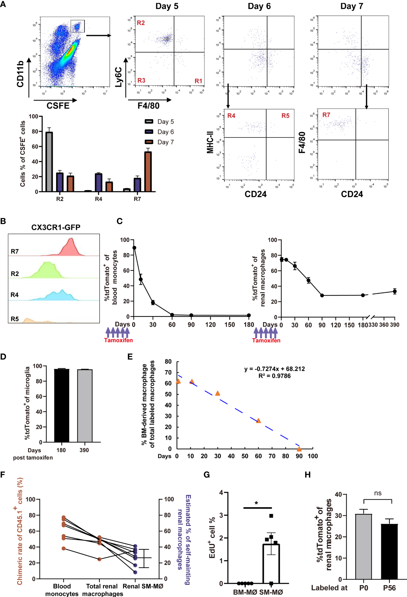 A recent study suggests that renal resident macrophages encompass both BM-derived macrophages and embryo-derived macrophages which are self-maintaining (19). CX3CR1 is expressed diversely in monocytes and tissue macrophages (30). In the kidney, macrophages (R7) were homogenously expressing CX3CR1 and they are the highest in CX3CR1 expression among mononuclear phagocyte subsets (Figure 4B). To discriminate SM-MØ from BM-derived macrophages in the kidney and to estimate their frequencies by the flow cytometry scheme developed by us, we crossed a mouse line of tamoxifen-inducible Cx3cr1CreERT2 controlled by the endogenous Cx3cr1 promoter with Rosa26-stop-tdTomato r reporter mice (termed Cx3cr1CreER/+:R26Td). Tamoxifen was first injected into 8-week old mice, and 1 day post tamoxifen treatment, the majority of CD115+CX3CR1+CD11b+ blood monocytes (89.6 ± 1.5%, mean ± SEM) and renal R7 macrophages (74.57 ± 4.45%) turned tdTomato+ (Figure 4C). Time-course analysis revealed that by 2 months, blood monocytes completely lost tdTomato expression, reflecting their continuous replacement by BM progenitors. Renal macrophages (R7) lost tdTomato+ cells in a slower pattern, and by 3 months, about 28.1 ± 5.27% cells retained tdTomato expression (Figure 4C and Figure S4). However, from then on, the mice did not lose tdTomato+ macrophages any more since there were still 28.35 ± 1.89% and 33.35 ± 4.88% macrophages being tdTomato+ when examined 180 days and even 390 days after labeling, respectively (Figure 4C). In contrast, on Day 180 and Day 390 after labeling, tdTomato+ cells respectively accounted for 96.28 ± 0.41% and 95.51 ± 0.21% of microglia, the turnover of which depends on self-renewal (Figure 4D) (39). Of note, 3 months after tamoxifen treatment, no other population except R7 contained tdTomato+ cells, implying that only a subset of macrophages but no other renal mononuclear phagocytes were self-maintaining. Estimated based on the First-order elimination kinetics, the residential half-life of BM-derived macrophages in the kidney was approximately 46.9 days (Figure 4E).