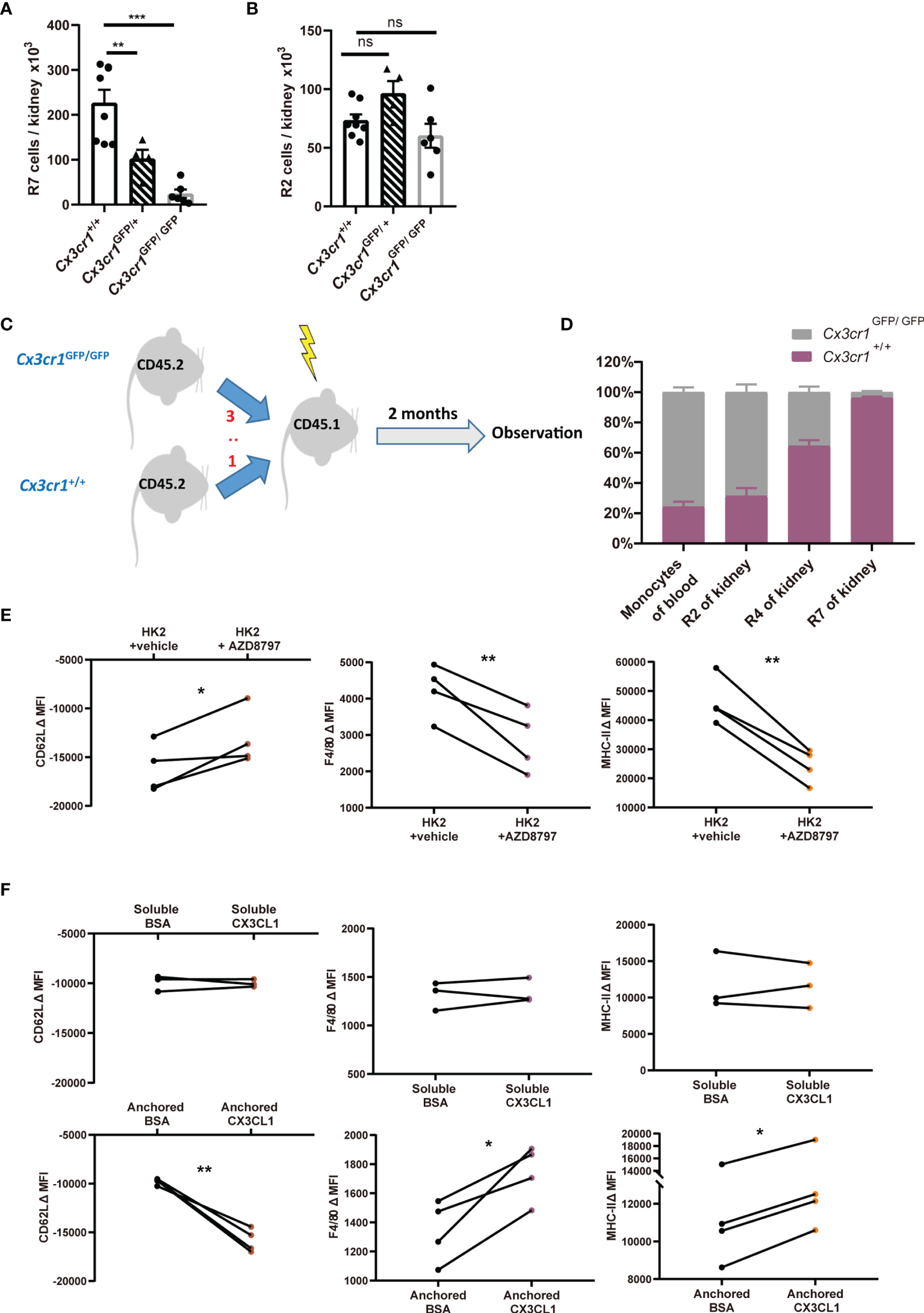 CX3CR1-dependent stepwise differentiation from classical monocytes to renal macrophages. (A, B) Quantification of renal macrophages (R7) (A) and classical monocytes (R2) (B) in Cx3cr1+/+, Cx3cr1GFP/+ and Cx3cr1GFP/GFP mice in steady state. P values were calculated using one-way ANOVA with Tukey’s multiple-comparisons testing. (C) Lethally irradiated CD45.1 mice were transplanted with a chimeric 3:1 BM mix from CD45.2 Cx3cr1GFP/GFP and Cx3cr1+/+ donors. (D) Eight weeks after transplantation, the ratios of Cx3cr1+/+vs. Cx3cr1GFP/GFP among CD45.2+ blood monocytes, renal classical monocytes (R2), renal nonclassical monocytes (R4) and renal macrophages (R7) are shown. (n=4 per group from 2 independent experiments). (E, F) The changes of mean fluorescent intensities (ΔMFI) of surface CD62L, F4/80 and MHC-II on classical monocytes after ex vivo culture. (E) Monocytes were co-incubated with renal epithelial HK-2 cells in the presence of vehicle or AZD8797, a CX3CR1 blocker. (F) monocytes were cultured in the presence of soluble (Upper panels) or anchored bovine serum albumin (BSA) or recombinant CX3CL1 (Lower panels). P values were calculated using a two-tailed paired t-test. *P < 0.05, **P < 0.01, ***P < 0.005. ns: not significant. All error bars indicate mean ± SEM.