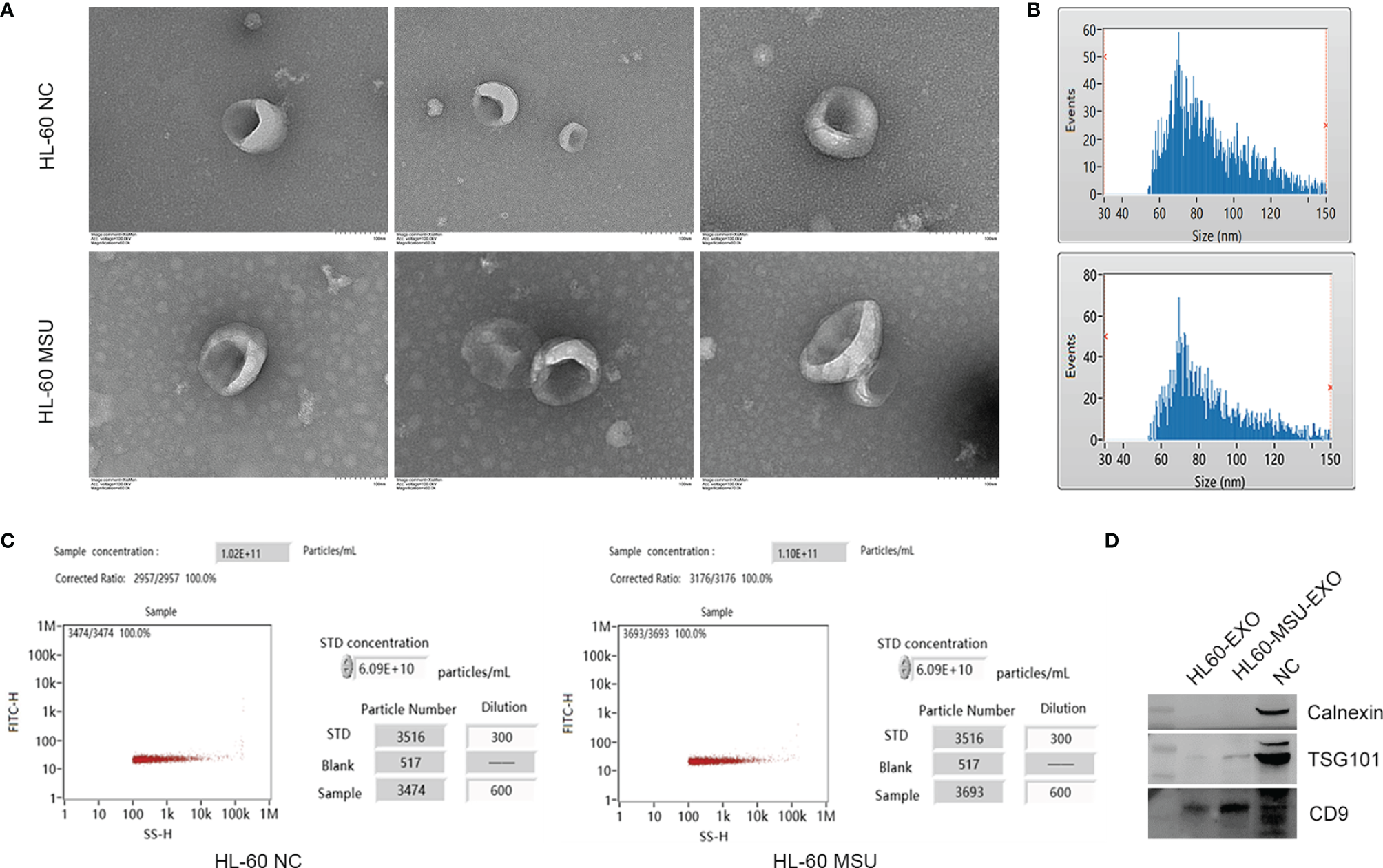 Characteristics of neutrophil-derived exosomes. (A) The size and shape of exosomes are observed by transmission electron microscopy (TEM). The size of exosomes ranges from 60 to 150 nm. (B) Schematically illustration of the distribution of exosome particle size. The particle size was assessed by nanoparticle tracking analysis (NTA). HL-60 NC: Median, 80.25 nm; Mean, 86.01 nm; SD, 21.05 nm; HL-60 MSU: Median, 82.25 nm; Mean, 87.69 nm; SD, 21.42 nm. (C) Schematically illustration of exosome particle concentration. (D) The exosome markers of CD9 and TSG101 are expressed obviously, and there is no expression of calnexin according to western blotting analysis.