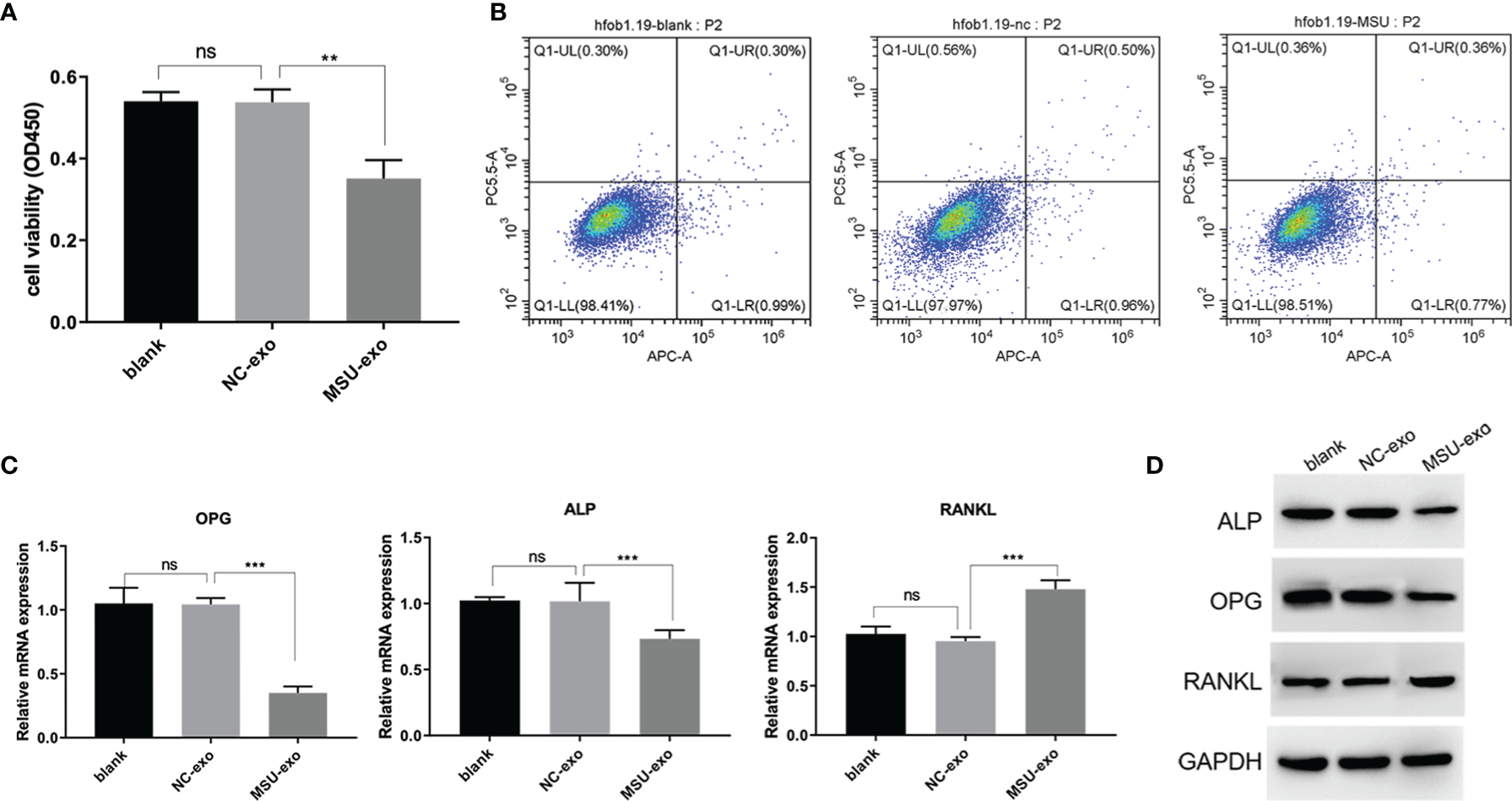 The effects of MSU-induced neutrophil-derived exosomes on hFOB. (A) CCK-8 assay is used to detect the cell viability. (B) Apoptosis is detected by flow cytometry. (C) QPCR was used to assess miRNA expression levels of ALP, OPG and RANKL. (D) Protein expression levels of ALP, OPG and RANKL in hFOB cultures were determined via western blot analysis. P<0.01**, P<0.001 ***determined by the t-test. ns, no significance.