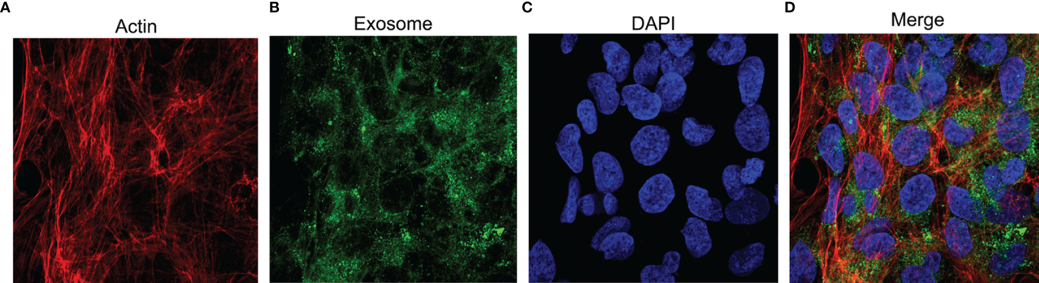 Neutrophil-derived exosomes were co-incubated with hFOB. Rhodamine-phalloidin was used to stain the actin cytoskeleton (Figure 4A), the exosomes were fluorescently labelled using the PKH67 dye (Figure 4B) and DAPI was used to counterstain the nucleus (Figure 4C) as previously described. The fluorescence signal indicating uptake of exosomes was observed, photographed and merged (Figure 4D) using a confocal laser microscope system. The results represented the endocytosis of exosomes by osteoblasts.