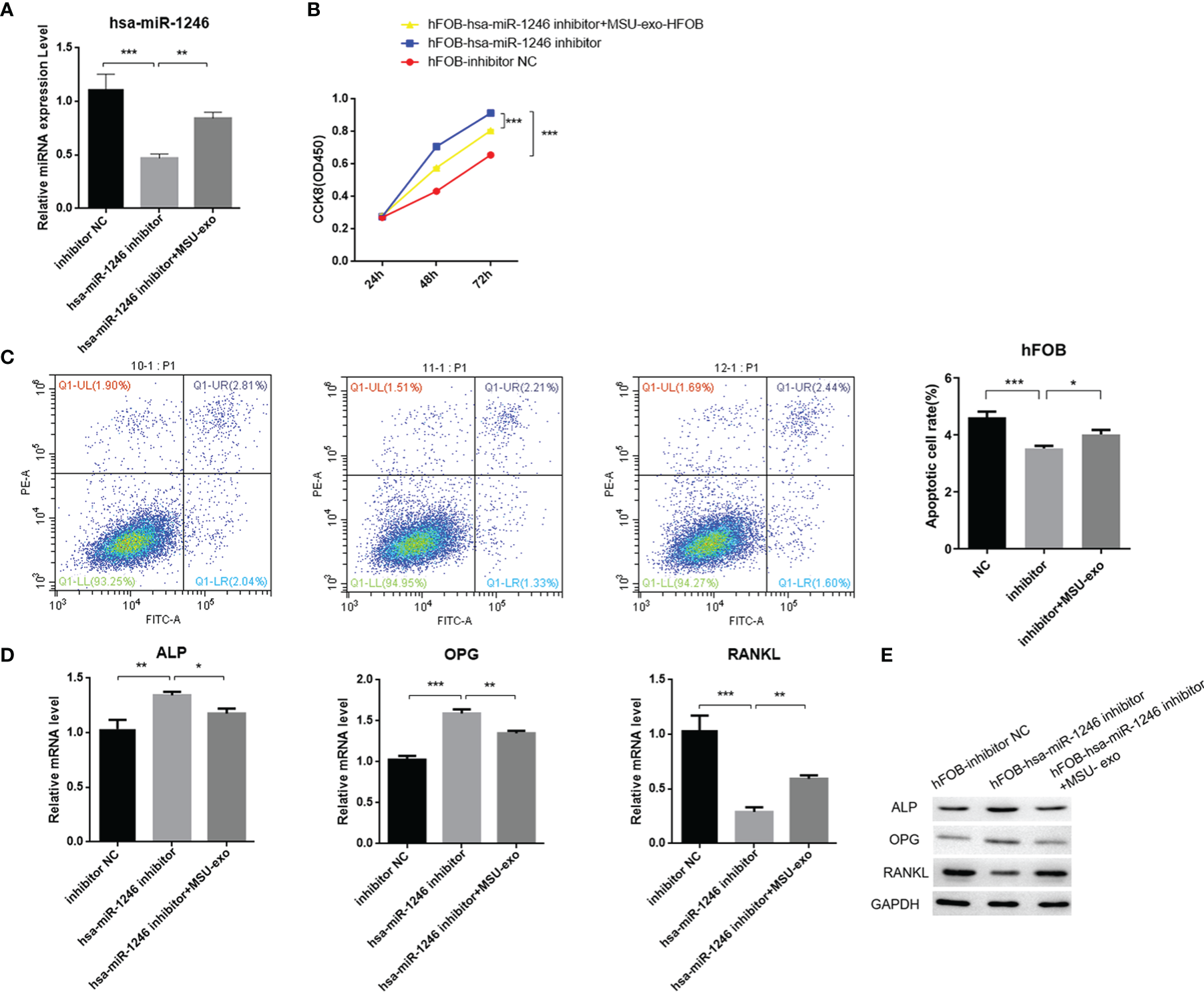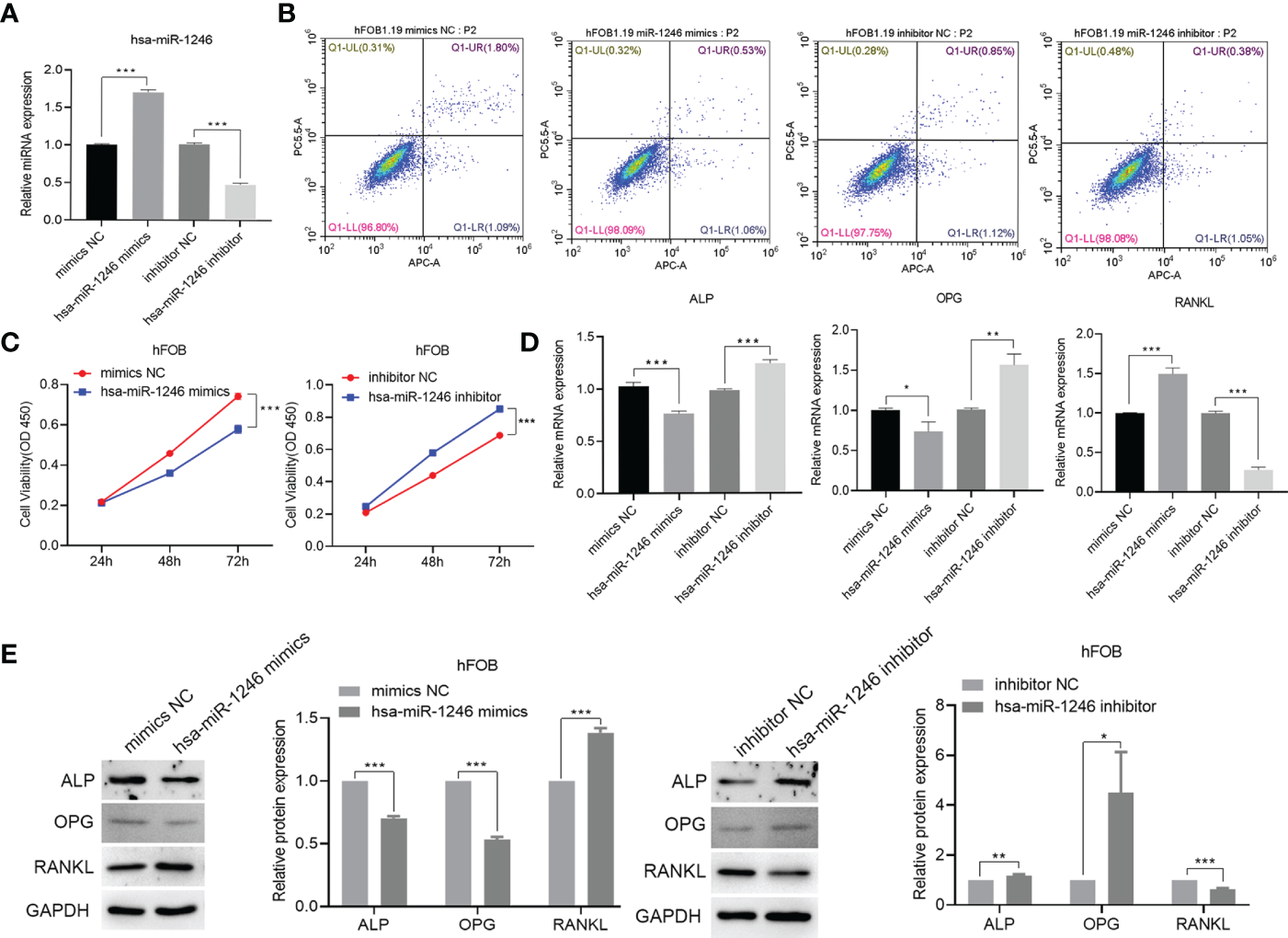 Construction of hsa-miR-1246 mimics and inhibitors. hFOB are cultured and transfected with hFOB-mimics NC, hFOB-inhibitor NC, hFOB-hsa-miR-1246 mimics, and hFOB-hsa-miR-1246 inhibitor. (A) Verified overexpression and interfering fragments by qPCR. (B) Cell apoptosis evaluated by flow cytometry. (C) Cell viability assessed using CCK-8. (D) QPCR to detect the expression levels of ALP, OPG, and RANKL. (E) Western blot analysis to determine the expression levels of ALP, OPG, and RANKL. (*P < 0.05, **P < 0.01, and ***P < 0.001).