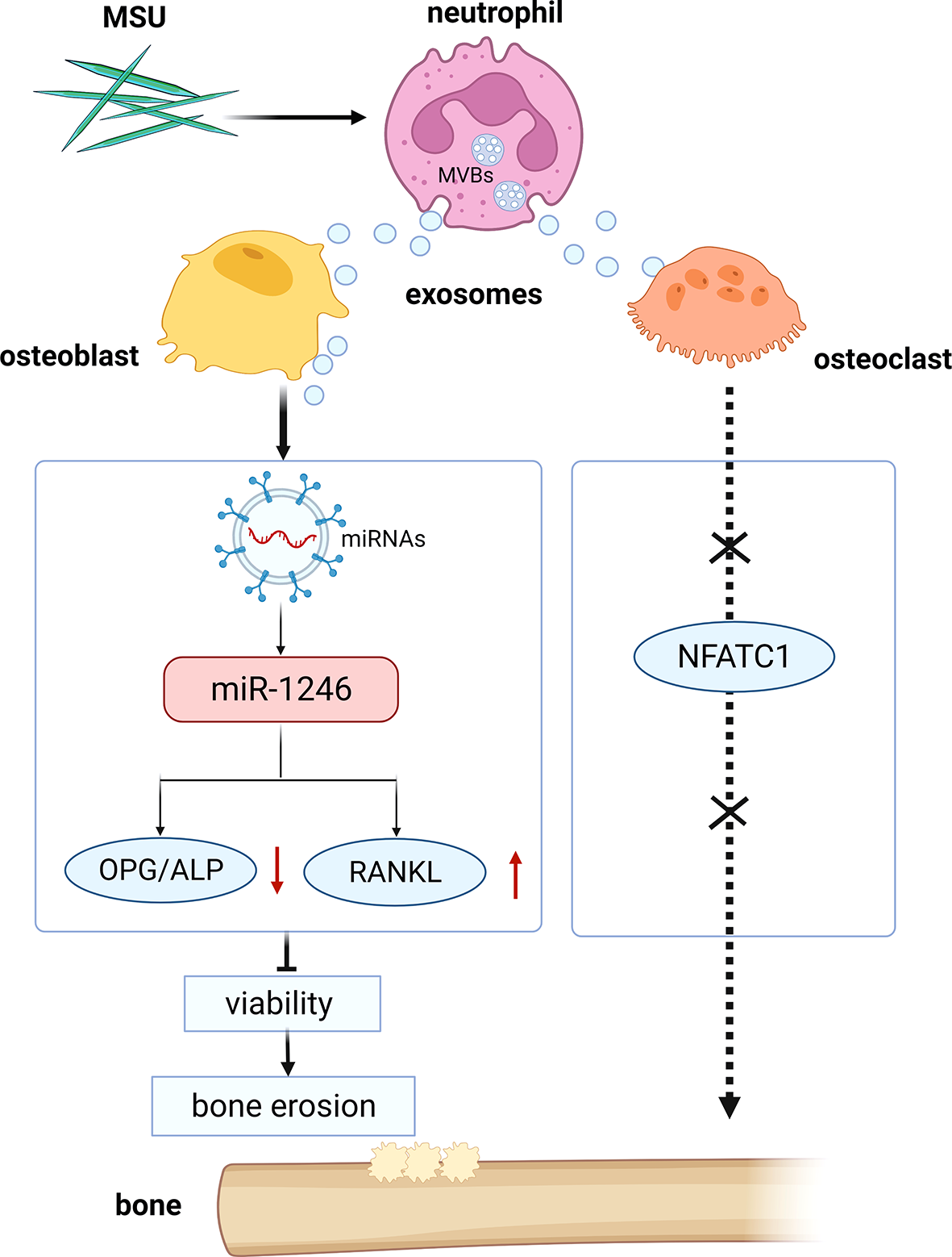 Schematic diagram of the study. Neutrophil-derived miRNA-1246-overexpression exosomes induced by MSU inhibit the viability of osteoblasts.