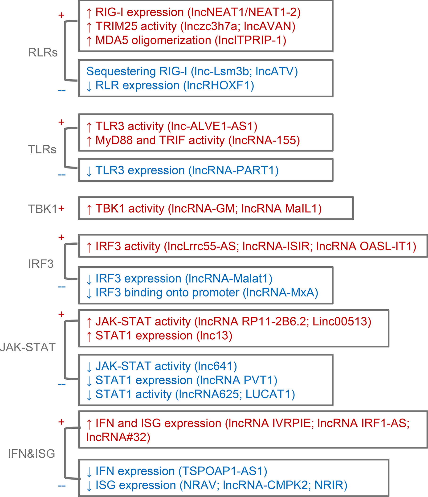 Brief summary of lncRNAs regulating IFN signaling. Based on proteins and events order, lncRNAs affecting RLRs, TLRs, TBK1, IRF3, JAK-STAT axis, IFN, and ISG expression are discussed. +, positive regulation. -, negative regulation.