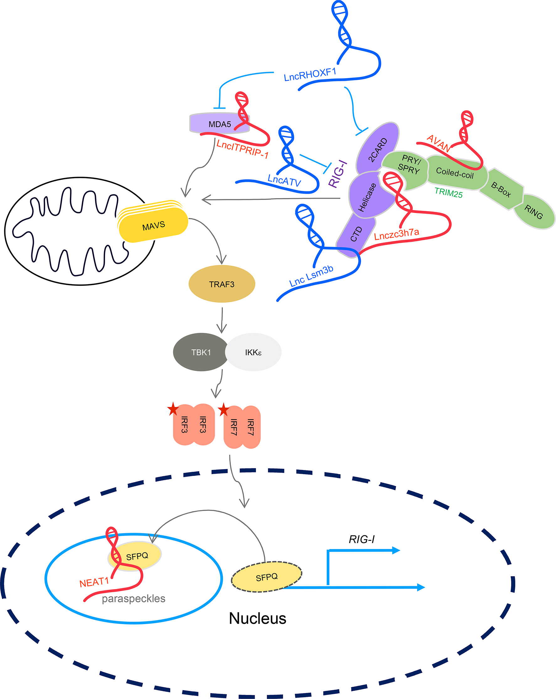 LncRNAs regulates RLR-mediated IFN signaling. LncRNA NEAT1, lnczc3h7a, AVAN, and lncITPRIP-1 positively regulate IFN signaling through targeting proteins indicated in the figure. Lnc-Lsm3b, lncATV, and lncRHOXF1 negatively regulate IFN signaling by targeting RIG-I and RLRs. Five-sided star represents phosphorylation modification. LncRNA in blue represents negative regulators; lncRNA in red is positive regulators for IFN signaling.