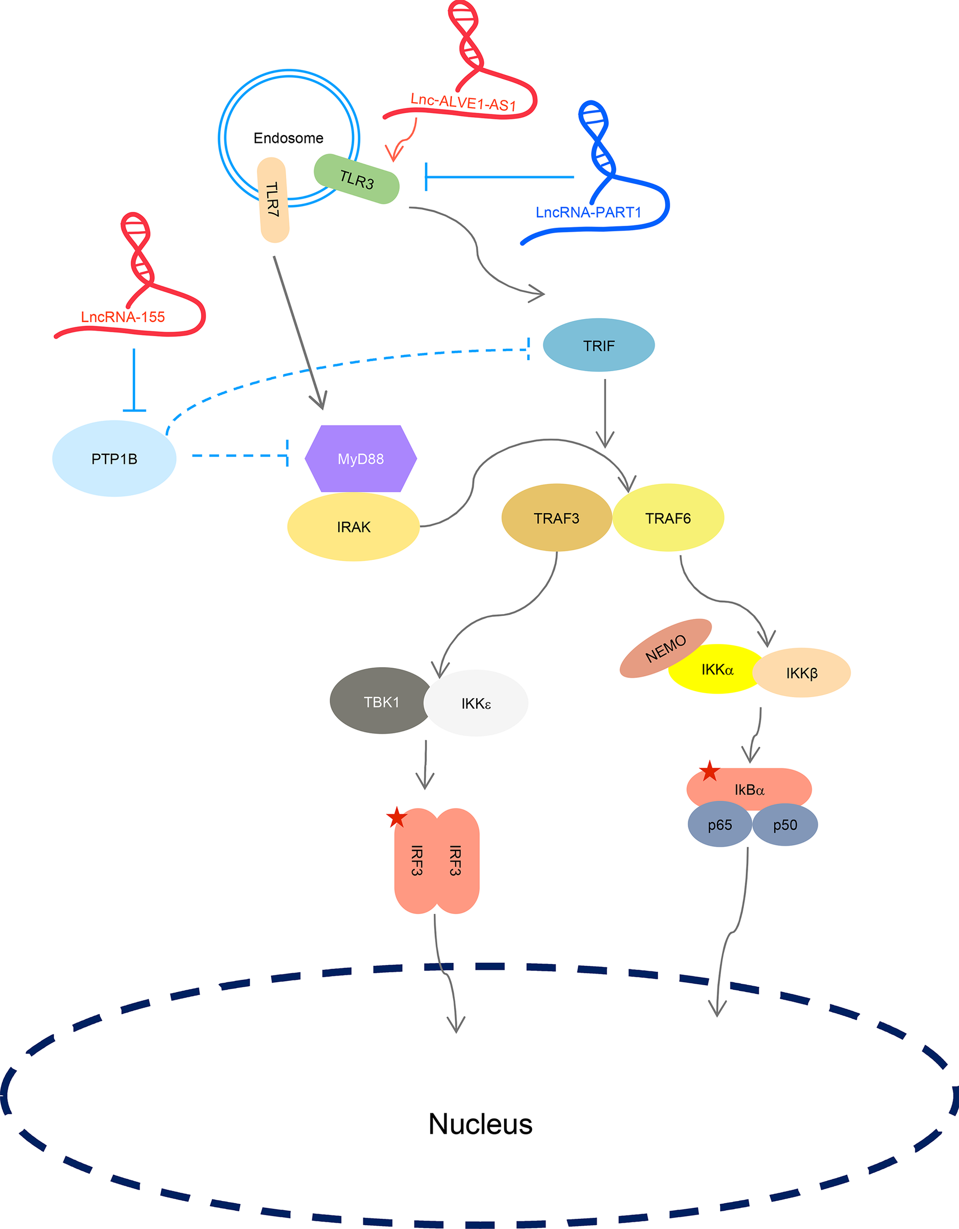 LncRNAs regulate TLR-mediated IFN signaling. LncRNA ALVE1-AS1 enhances TLR3-mediated IFN signaling. LncRNA-155 targets PTP1B. LncRNA-PART1 negatively affects TLR-mediated IFN signaling. “U” represents ubiquitination modification. Five-sided star represents phosphorylation modification. LncRNA in blue represents negative regulators; lncRNA in red is positive regulators for IFN signaling.