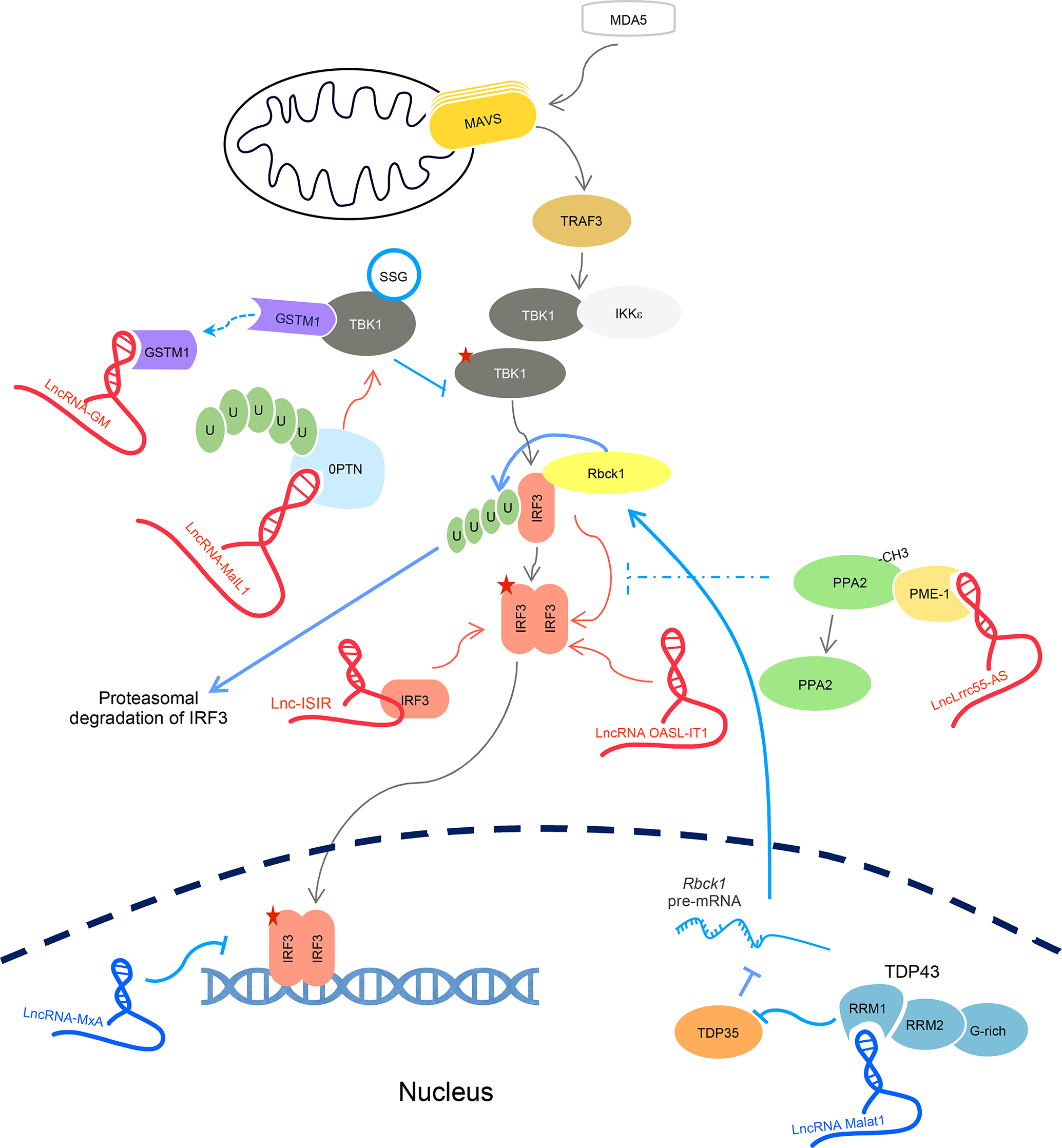 LncRNAs regulate downstream cascades for IFN-I activation. LncRNA-GM targets GSTM1 to disrupt GSTM1-directed S-glutathionylation of TBK1 (SSG), thus promoting TBK1 for its kinase activity. LncRNA MaIL1 targets OPTN to facilitate OPTN-TBK1 binding for TBk1 kinase activity. LncRNA OASL-IT1, lncRNA-ISIR, and lncLrrc55-AS facilitate IRF3 phosphorylation. LncRNA Malat1 downregulates IRF3 abundance by targeting TDP43. LncRNA-MxA inhibits IRF3 binding onto the IFN promoter region. Five-sided star represents phosphorylation modification. LncRNA in blue represents negative regulators; lncRNA in red is positive regulators for IFN signaling.