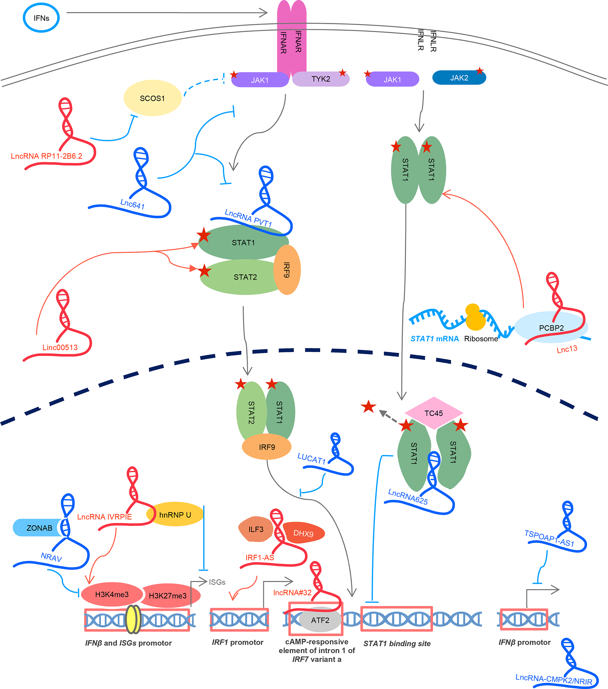 LncRNAs regulates IFN and ISG transcription. IFN signals through binding to the receptors and activation of downstream JAK-STAT cascades. LncRNA RP11-2B6.2, linc00513, and lnc13 enhance JAK-STAT activities. LncRNA IVRPIE, IRF1-AS, and lncRNA#32 enhance IFN and ISG transcription. Lnc641, PVT1, lncRNA625, and LUCAT1 downregulate JAK-STAT activity. LncRNA TSPOAP1-AS1, NRAV, and lncRNA-CMPK2 decrease IFN and ISG transcription. Five-sided star represents phosphorylation modification. LncRNA in blue represents negative regulators; lncRNA in red is positive regulators for IFN signaling.